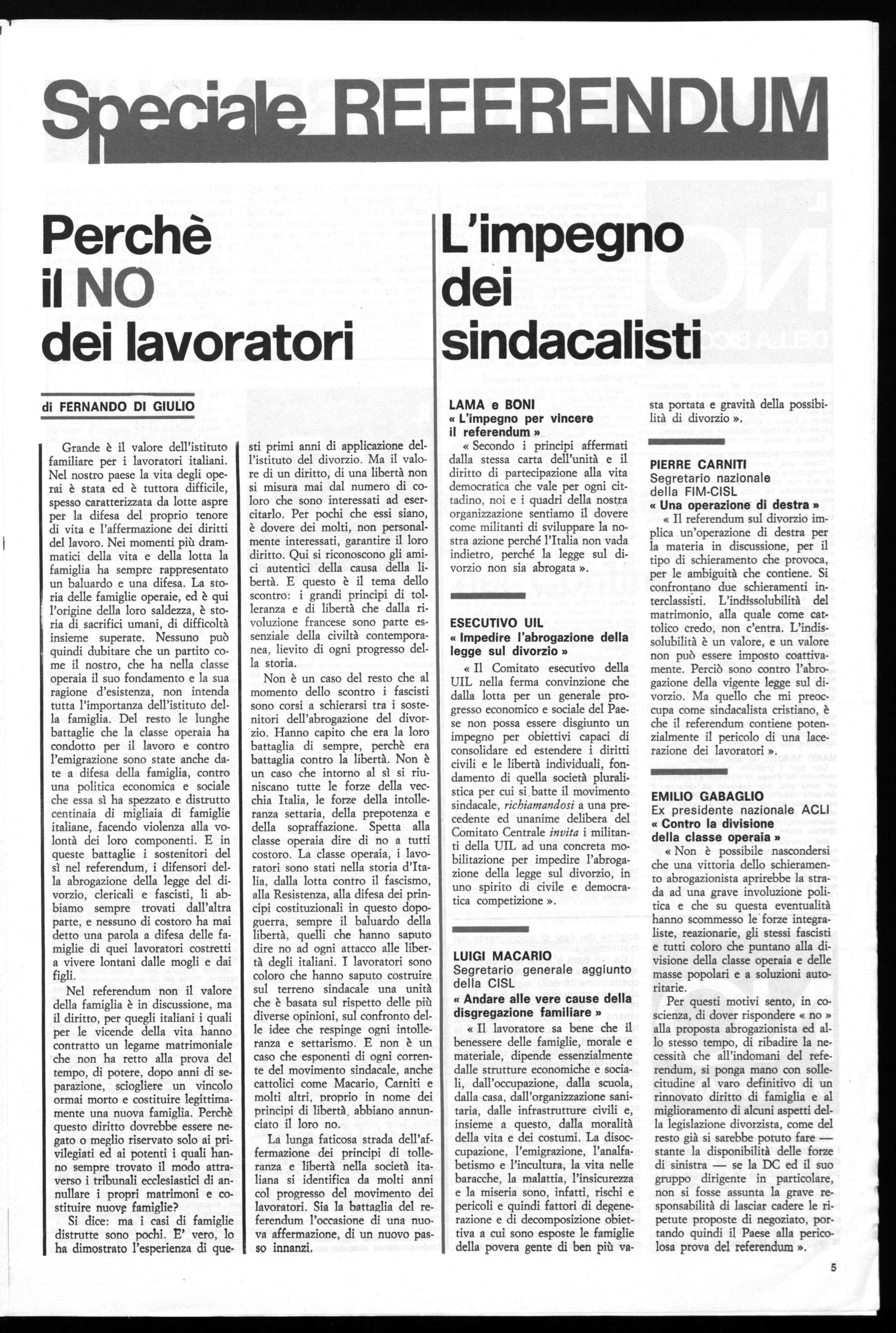 vesse accompagnare alle polemiche contro la Chiesa, persino contro posizioni tradizionali dei cattolici italiani. Condannammo molte delle posizioni e i toni dei radicali da noi giudicati residuo del passato fra i laici, quanto le posizioni retrive e le chiusure clericali, che parevano via via venir superate nel mondo cattolico e nella stessa Chiesa post-conciliare. Si vuole il referendum, per una azione di prepotenza all'interno della DC, attraverso l'imposizione di una linea di rottura dei processi unitari, di differenziazione ideologica e di distacco nel confronto degli alleati del centro-sinistra. Con l'accordo di fatto con la destra su questa questione e in questa battaglia, si vuole mostrare che è reversibile la politica attuale, si vogliono ricattare i partiti laici. Peggio, forse, si vogliono esplorare le possibilità di soluzioni alternative di centro-destra, dí pericolose manovre nelle quali la destra, fino a quella fascista, può essere coinvolta. Si torna a giocare con pesantezza sempre più evidente la carta dello scissionismo, dell'anticomunismo, ritornando alle nostalgie quarantottesche e scelbiane.