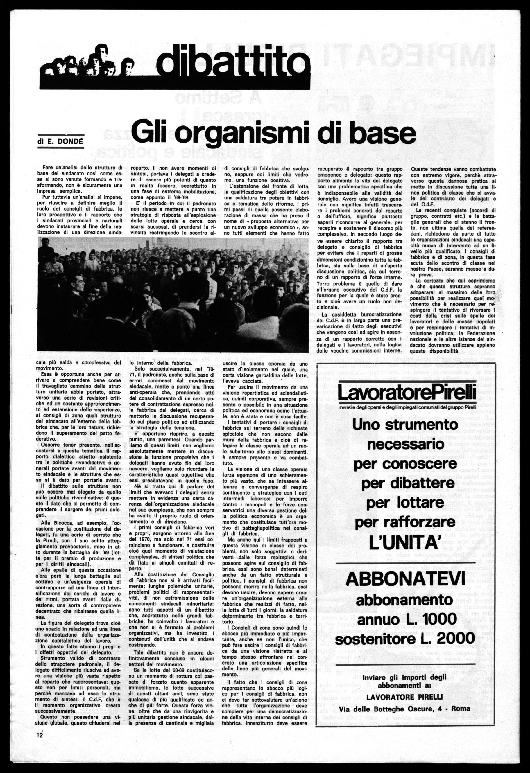 Se le lotte del 68-69 costituiscono un momento di rottura col passato di forzato quanto apparente immobilismo, le lotte successive di questi ultimi anni, sono state qualcosa dl più qualificato ed anche di più forte. Questa forza viene, oltre che da una rinvigorita e più unitaria gestione sindacale, dalla presenza di centinaia e migliaia