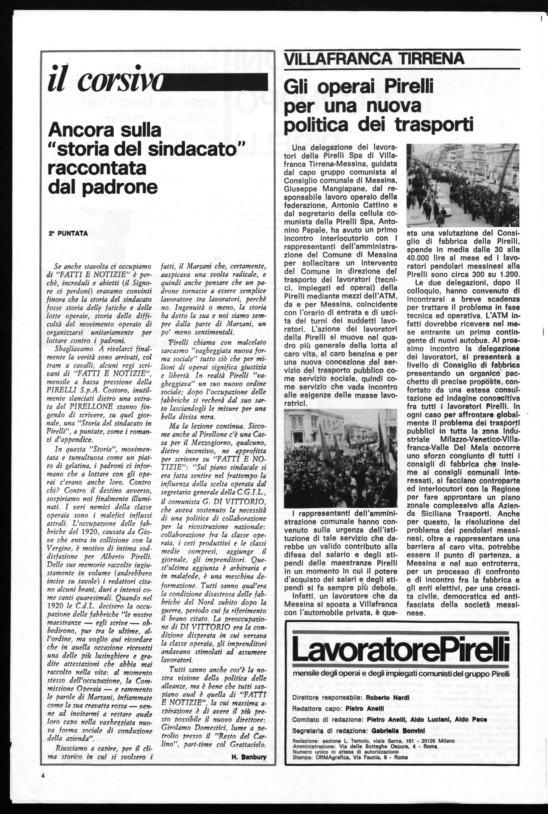 Sbagliavamo. A rivelarci finalmente la verità sono arrivati, col tram a cavalli, alcuni regi scrivani di "FATTI E NOTIZIE", mensile a bassa pressione della PIRELLI S.p.A. Costoro, inutilmente slanciati dietro una vetrata del PIRELLONE stanno fingendo di scrivere, su quel giornale, una "Storia del sindacato in Pirelli", a puntate, come i romanzi d'appendice.