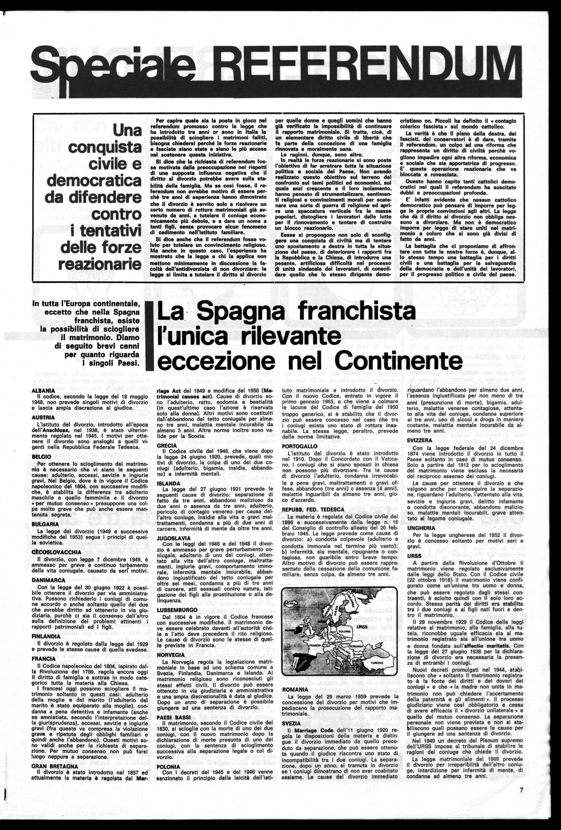 Noi abbiamo detto e ripetiamo, che siamo disposti a perfezionare questa legge, a introdurre in essa modifiche anche importanti per venire incontro a esigenze e proposte di parte cattolica e per allargare le basi del consenso attorno alla legge stessa. Questo impegno resta, anche per domani, se si uscirà vittoriosi da questa prova. Ma quel che vogliono i promotori del referendum è, invece, la liquidazione di ogni possibilità di regolamentare giuridicamente, in qualsiasi modo, i casi di scioglimento del matrimonio. Si creerebbe in tal modo un vuoto e quindi un disordine anche giuridico: si farebbe mancare quella tutela che la legge oggi assicura alle donne e ai figli e che prima non esisteva. Anche da questo punto di vista, dunque, si rivela l'irrazionalità del referendum, che, se ha una logica, è solo una logica dí intolleranza e di sopraffazione. Ecco perché diciamo che si tratta di una battaglia di libertà e ciò è qualcosa di diverso da un'im-