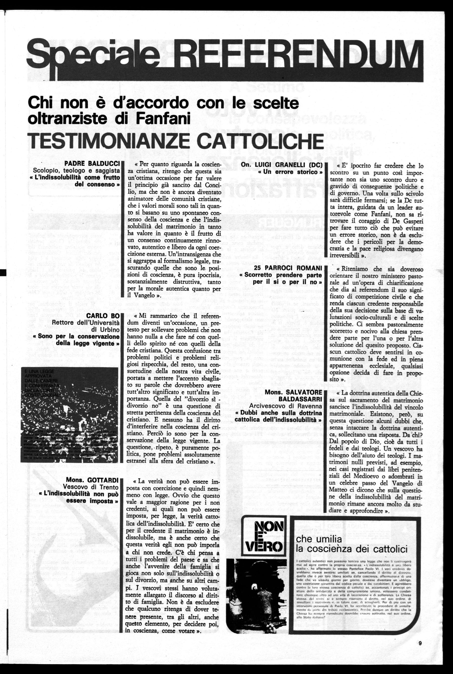 « Mi rammarico che il referendum diventi un'occasione, un pretesto per sollevare problemi ché non hanno nulla a che fare né con quelli dello spirito né con quelli della fede cristiana. Questa confusione tra problemi politici e problemi religiosi rispecchia, del resto, una consuetudine della nostra vita civile, portata a mettere l'accento sbagliato su parole che dovrebbero avere tutt'altro significato e tutt'altra importanza. Quella del "divorzio sìdivorzio no" è una questione di stretta pertinenza della coscienza del cristiano. E nessuno ha il diritto d'interferire nella coscienza del cristiano. Perciò io sono per la conservazione della legge vigente. La questione, ripeto, è puramente politica, pone problemi assolutamente estranei alla sfera del cristiano ».