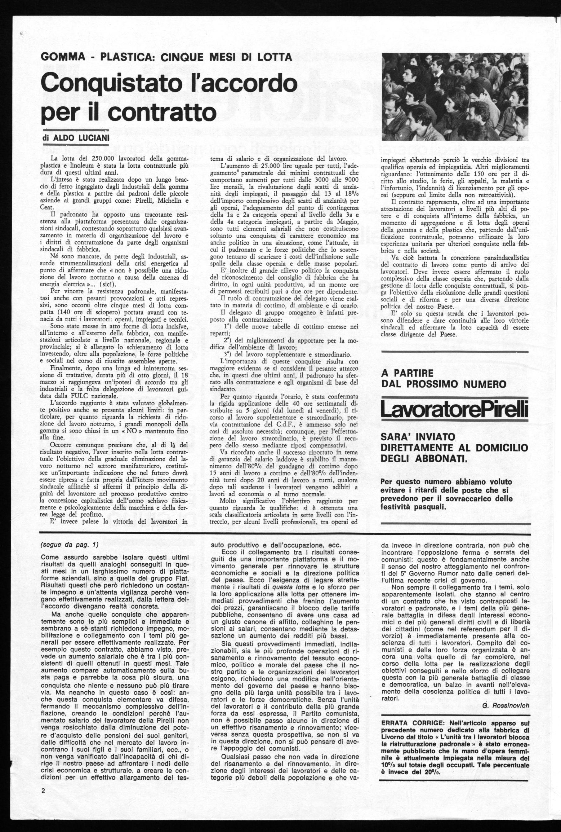 La seconda ,onsiderazione è che un accordo, per quanto importante esso sia, per quanto riguardi un grande gruppo come la Pirelli, o una intera categoria, ha tanto più valore quanto non si limita a porre questioni e conseguire obiettivi che riguardano solo l lavoratori di quella azienda o dl quella categoria, ma si collega al movimento generale che l'intera classe operaia porta avanti in difesa degli interessi di tutti 1 lavoratori e di tutti coloro i cui interessi stanno dalla stessa parte di quelli dei lavoratori.