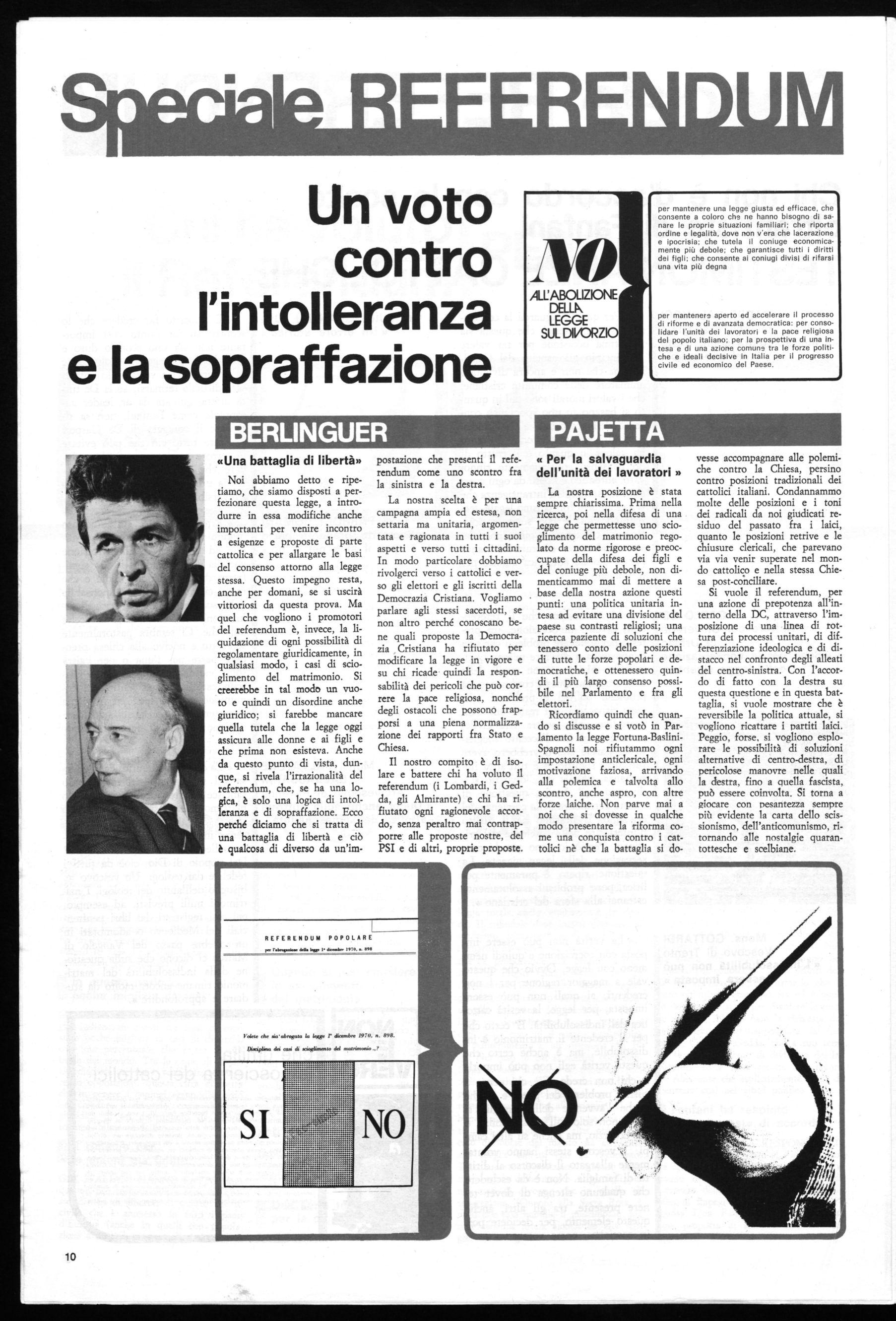 La nostra scelta è per una campagna ampia ed estesa, non settaria ma unitaria, argomentata e ragionata in tutti i suoi aspetti e verso tutti i cittadini. In modo particolare dobbiamo rivolgerci verso i cattolici e verso gli elettori e gli iscritti della Democrazia Cristiana. Vogliamo parlare agli stessi sacerdoti, se non altro perché conoscano bene quali proposte la Democrazia Cristiana ha rifiutato per modificare la legge in vigore e su chi ricade quindi la responsabilità dei pericoli che può correre la pace religiosa, nonché degli ostacoli che possono frapporsi a una piena normalizzazione dei rapporti fra Stato e Chiesa.