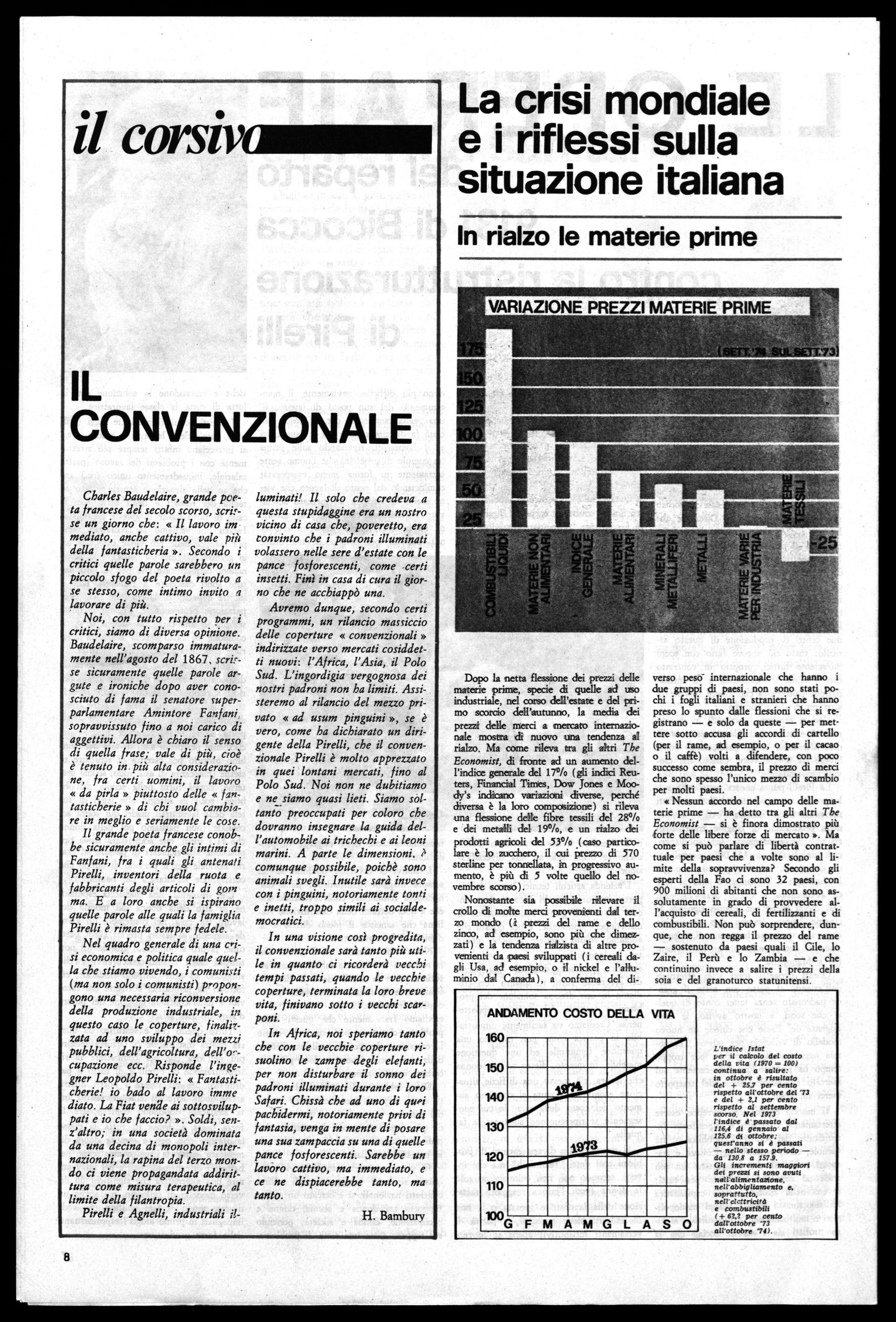 Nel quadro generale di una crisi economica e politica quale quella che stiamo vivendo, i comunisti (ma non solo i comunisti) propongono una necessaria riconversione della produzione industriale, in questo caso le coperture, finalitzata ad uno sviluppo dei mezzi pubblici, dell'agricoltura, dell'o-cupazione ecc. Risponde rinegner Leopoldo Pirelli: « Fantasticherie! io bado al lavoro imme diato. La Fiat vende ai sottosviluppati e io che faccio? ». Soldi, senz'altro; in una società dominata da una decina di monopoli internazionali, la rapina del terzo mondo ci viene propagandata addirittura come misura terapeutica, al limite della filantropia.