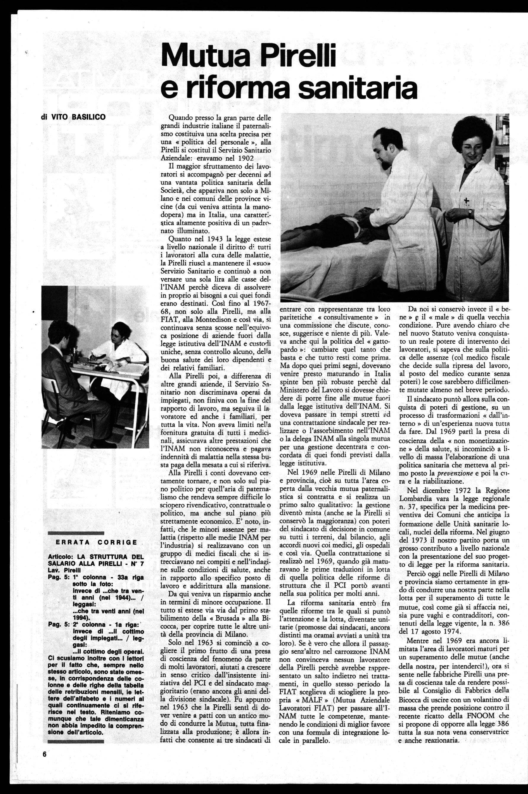 Nel dicembre 1972 la Regione Lombardia vara la legge regionale n. 37, specifica per la medicina preventiva dei Comuni che anticipa la formazione delle Unità sanitarie locali, nuclei della riforma. Nel giugno del 1973 il nostro partito porta un grosso contributo a livello nazionale con la presentazione del suo progetto di legge per la riforma sanitaria. Perciò oggi nelle Pirelli di Milano e provincia siamo certamente in grado di condurre una nostra parte nella lotta per il superamento di tutte le mutue, così come già si affaccia nei, sia pure vaghi e contradditori, contenuti della legge vigente, la n. 386 del 17 agosto 1974.