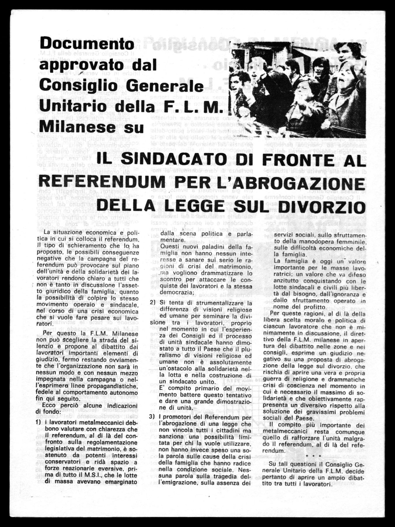 Per queste ragioni, al di là della libera scelta morale e politica di ciascun lavoratore che non è minimamente in discussione, il direttivo della F.L.M. milanese in apertura del dibattito nelle zone e nei consigli, esprime un giudizio negativo su una proposta di abrogazione della legge sul divorzio, che rischia di aprire una vera e propria guerra di religione e drammatiche crisi di coscienza nel momento in cui è necessario il massimo di solidarietà e che obiettivamente rappresenta un diversivo rispetto alla soluzione dei gravissimi problemi sociali del Paese.