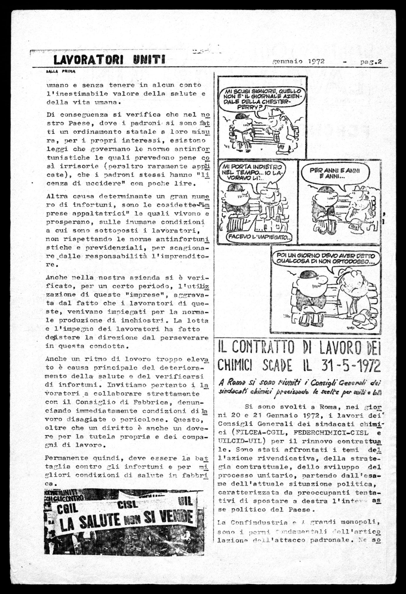 Anche un ritmo di lovoro troppo eleva to è causa principale del deterioramento della salute e del verificarsi di infortuni. Invitiamo pertanto i la -iroratori .a collaborare strettamente con il Consiglio di Fabbrica, denunciando immediatamente condizioni di la vero disagiate o pericolose. Questo, oltre che un diritto è anche un dovere per la tutela propria e dei compagni di lavoro.