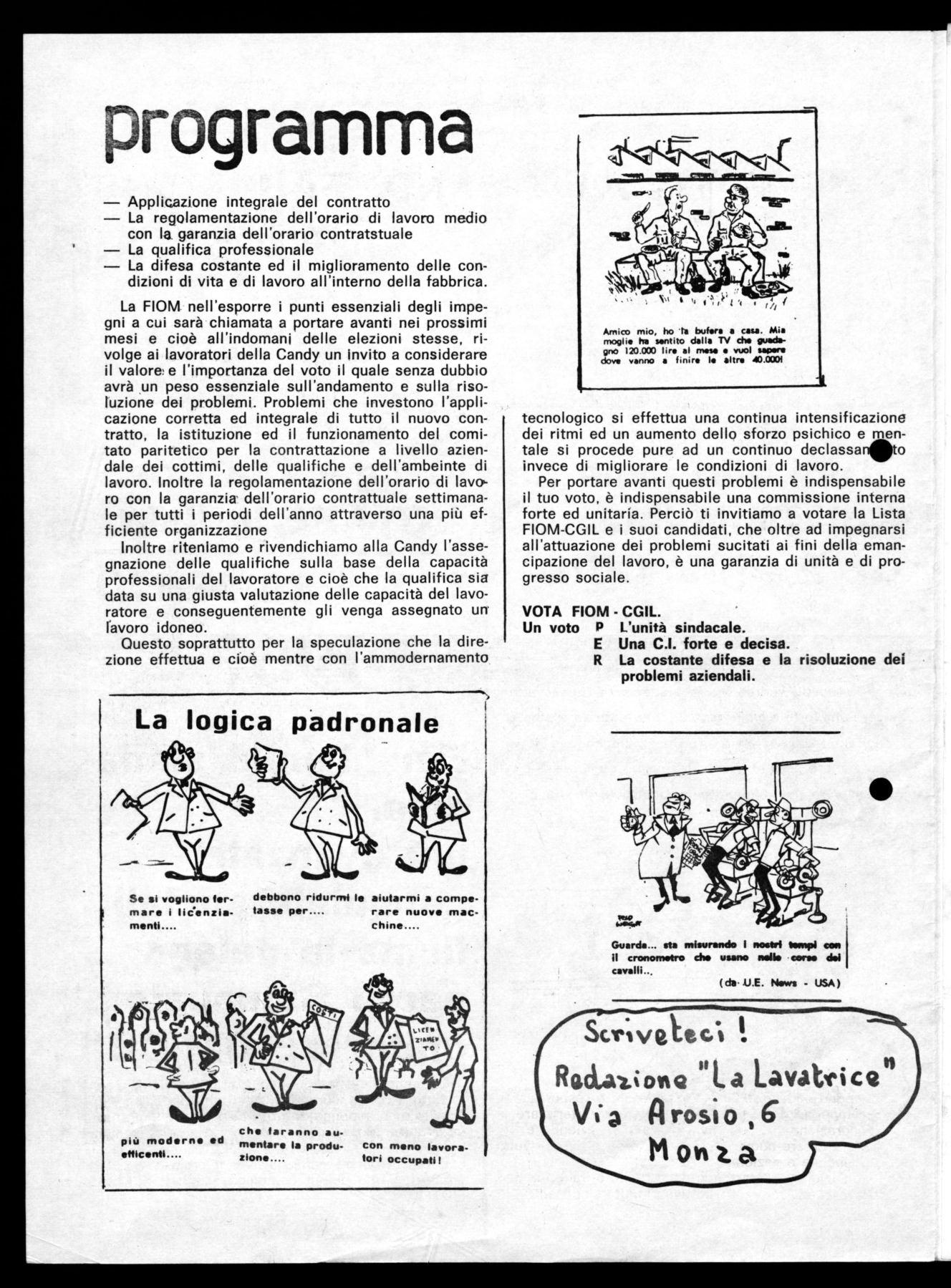 La FIOM nell'esporre i punti essenziali degli impegni a cui sarà chiamata a portare avanti nei prossimi mesi e cioè all'indomani delle elezioni stesse, rivolge ai lavoratori della Candy un invito a considerare il valore, e l'importanza del voto il quale senza dubbio avrà un peso essenziale sull'andamento e sulla risoluzione dei problemi. Problemi che investono l'applicazione corretta ed integrale di tutto il nuovo contratto, la istituzione ed il funzionamento del comitato paritetico per la contrattazione a livello aziendale dei cottimi, delle qualifiche e dell'ambeinte di lavoro. Inoltre la regolamentazione dell'orario di lavoro con la garanzia dell'orario contrattuale settimanale per tutti i periodi dell'anno attraverso una più efficiente organizzazione