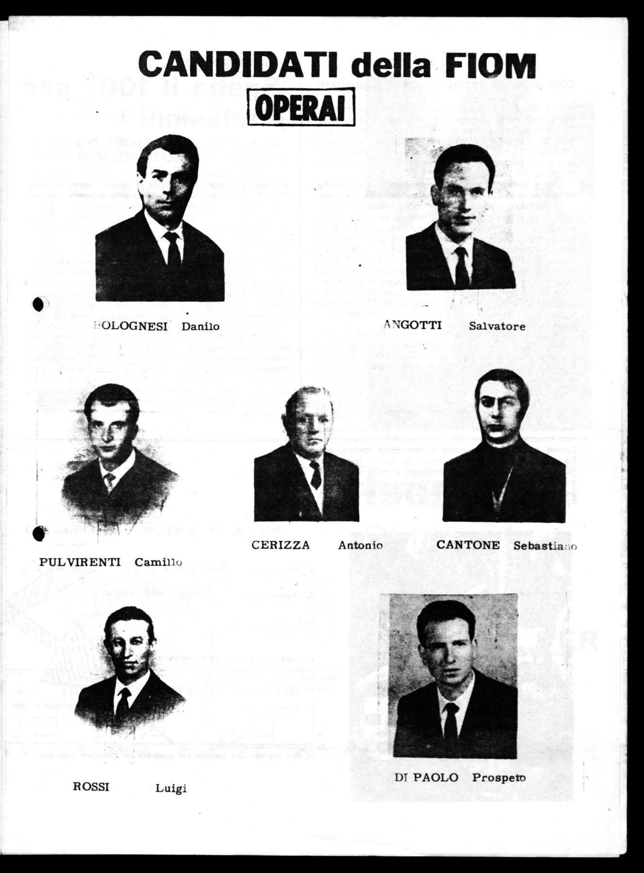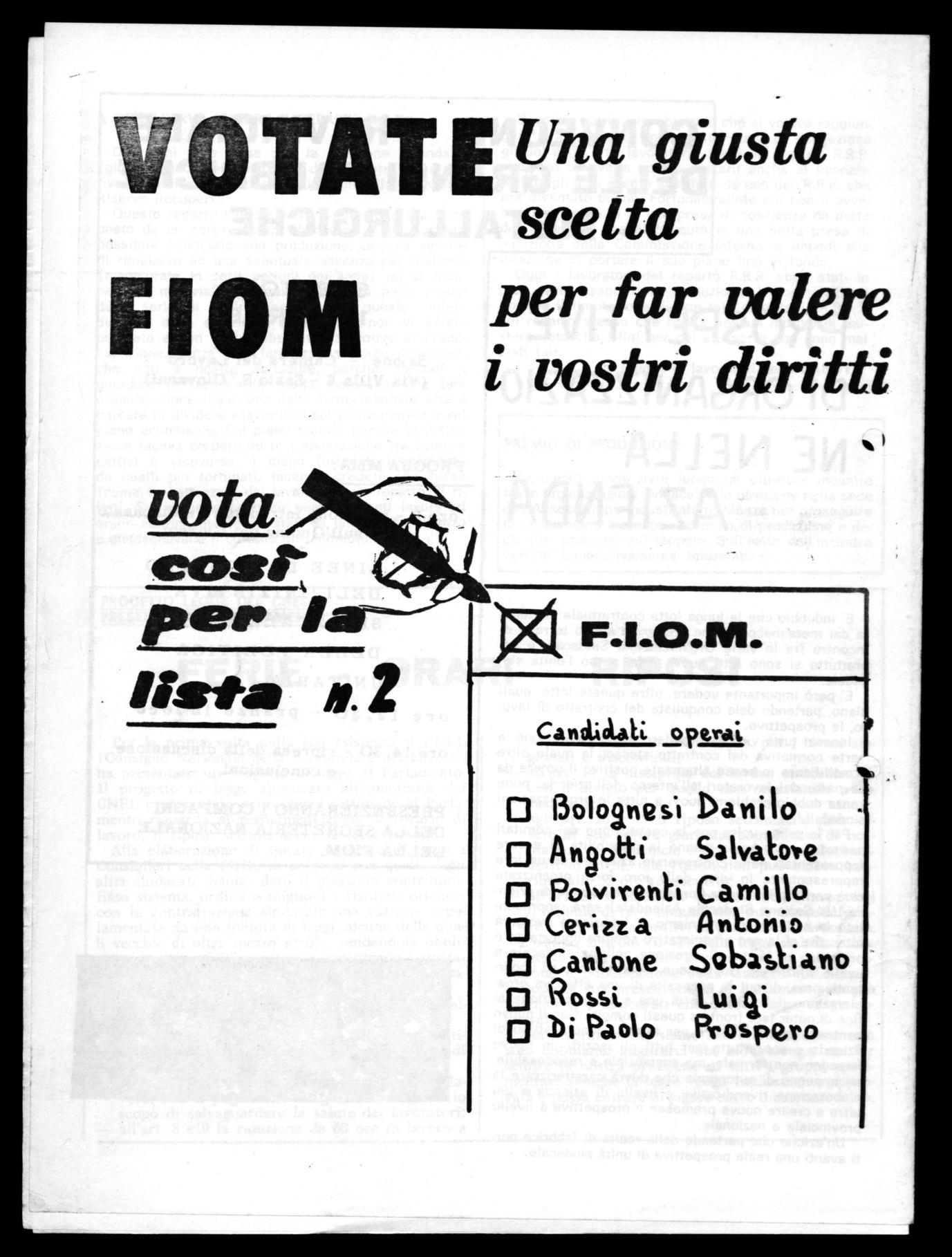 Per portare avanti questi problemi è indispensabile il tuo voto, è indispensabile una commissione interna forte ed unitaria. Perciò ti invitiamo a votare la Lista FIOM-CGIL e i suoi candidati, che oltre ad impegnarsi all'attuazione dei problemi sucitati ai fini della emancipazione del lavoro, è una garanzia di unità e di progresso sociale.