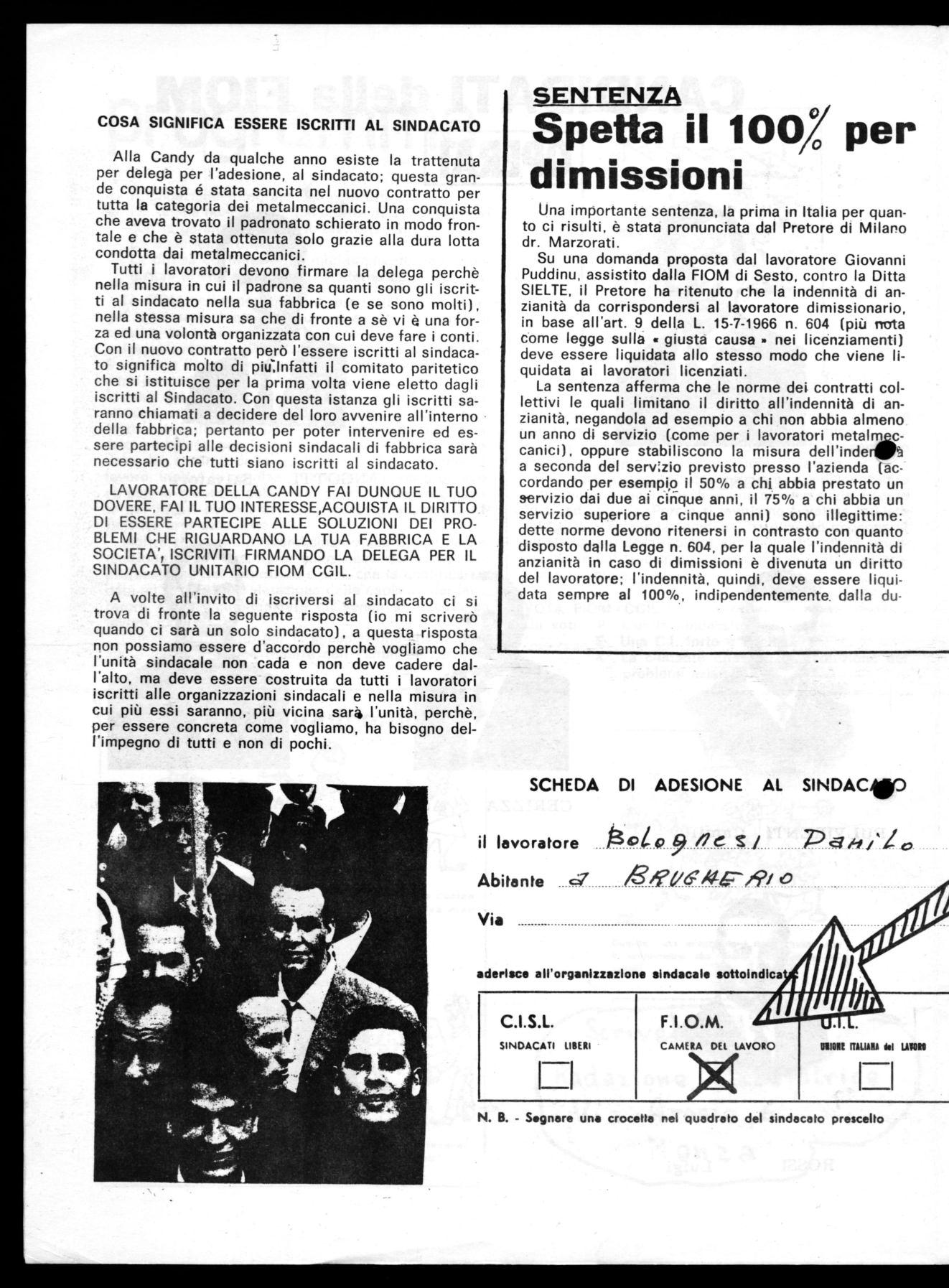 LAVORATORE DELLA CANDY FAI DUNQUE IL TUO DOVERE, FAI IL TUO INTERESSE,ACOUISTA IL DIRITTO DI ESSERE PARTECIPE ALLE SOLUZIONI DEI PROBLEMI CHE RIGUARDANO LA TUA FABBRICA E LA SOCIETA'lISCRIVITI FIRMANDO LA DELEGA PER IL SINDACATO UNITARIO FIOM CGIL.