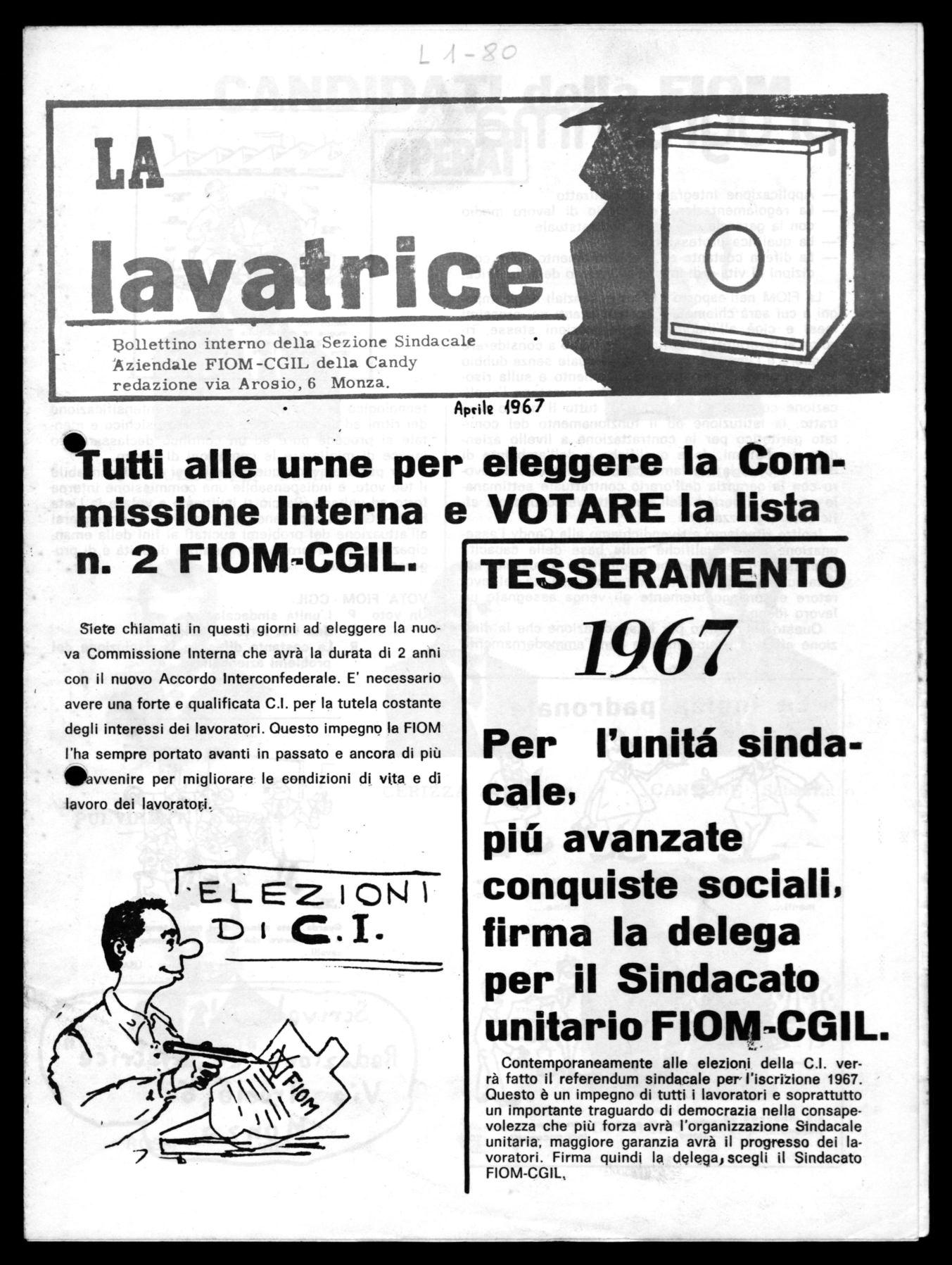Contemporaneamente alle elezioni della C.I. verrà fatto il referendum sindacale per l'iscrizione 1967. Questo è un impegno di tutti i lavoratori e soprattutto un importante traguardo di democrazia nella consapevolezza che più forza avrà l'organizzazione Sindacale unitaria, maggiore garanzia avrà il progresso dei lavoratori. Firma quindi la delega, scegli il Sindacato FIOM-CGIL,