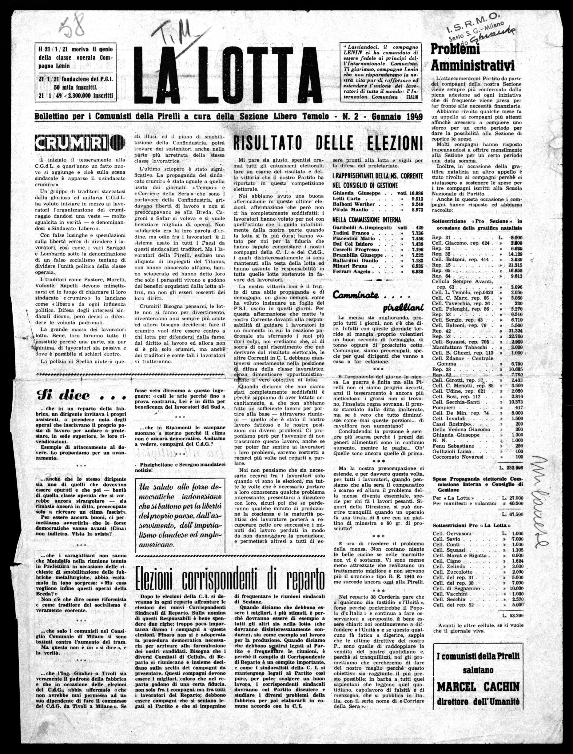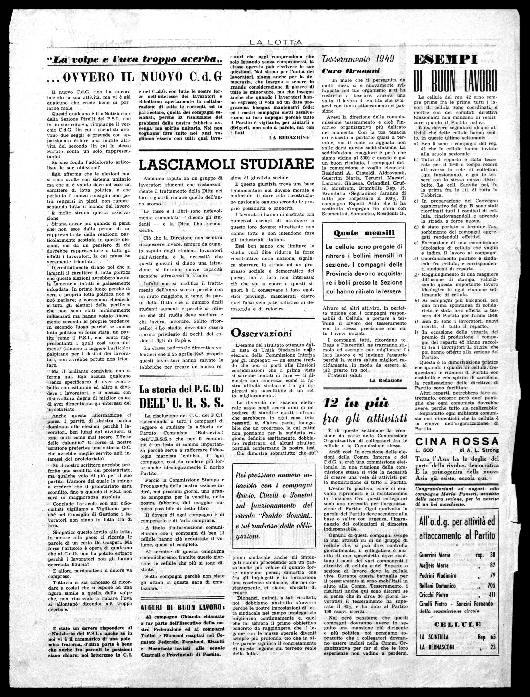 Noi abbiamo avuto una buona affermazione in queste ultime elezioni. affermazione che però non ci ha completamente soddisfatti; i lavoratori hanno votato per noi con quell'istinto che li guida infallibilmente dalla nostra parte quando la lotta si fa più dura; hanno votato per noi per la fiducia che hanno saputo conquistare i nostri compagni della C. I. e del C.d.G.. i quali disinteressatamente si sono mantenuti alla testa della lotta ed hanno assunto le responsabilità in tutte quelle lotte sostenute in favore dei lavoratori.