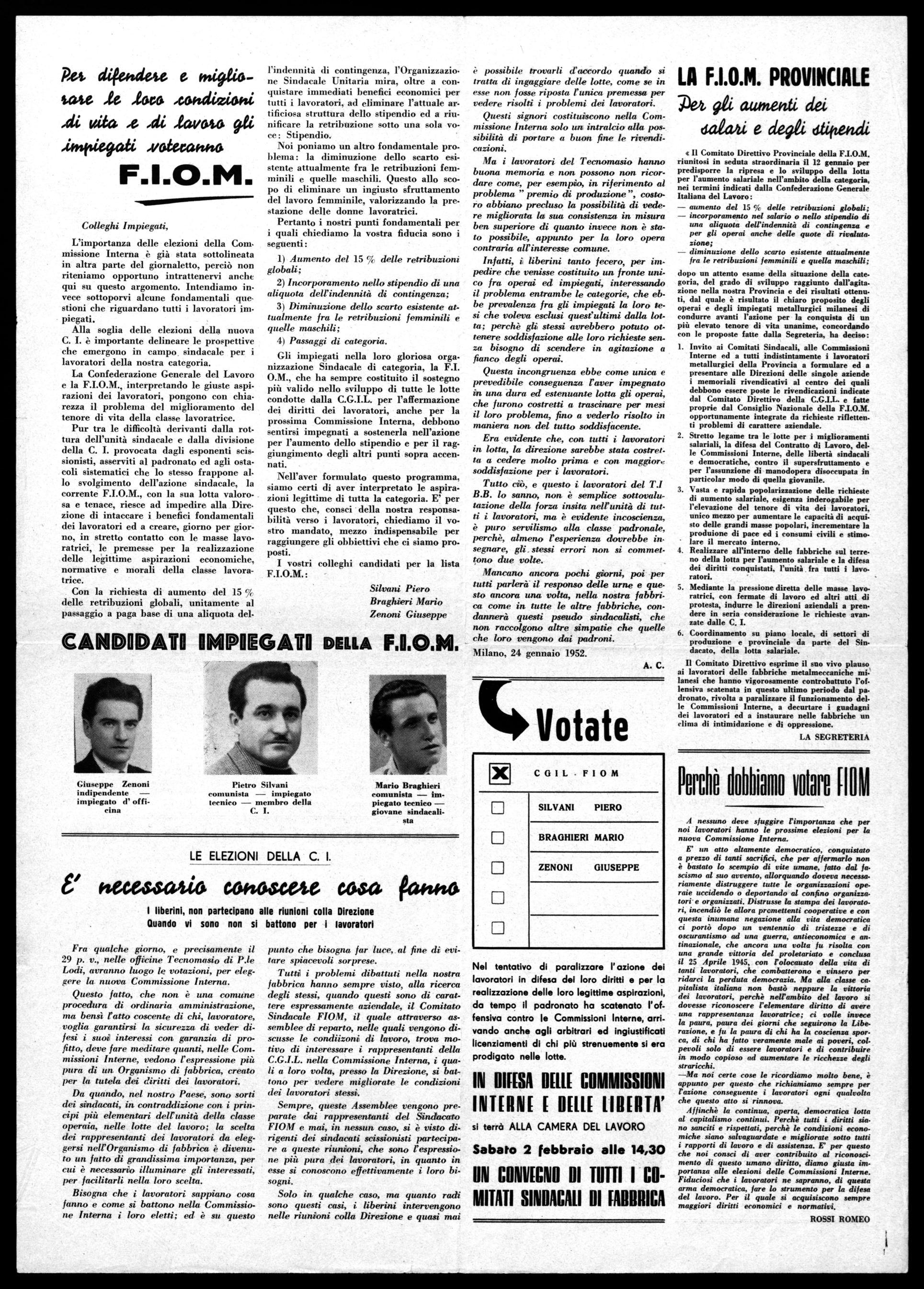 Gli impiegati nella loro gloriosa organizzazione Sindacale di categoria, la F.I. 0.M., che ha sempre costituito il sostegno più valido nello sviluppo di tutte le lotte condotte dalla C.G.I.L. per l'affermazione dei diritti dei lavoratori, anche per la prossima Commissione Interna, debbono sentirsi impegnati a sostenerla nell'azione per l'aumento dello stipendio e per il raggiungimento degli altri punti sopra accennati.
