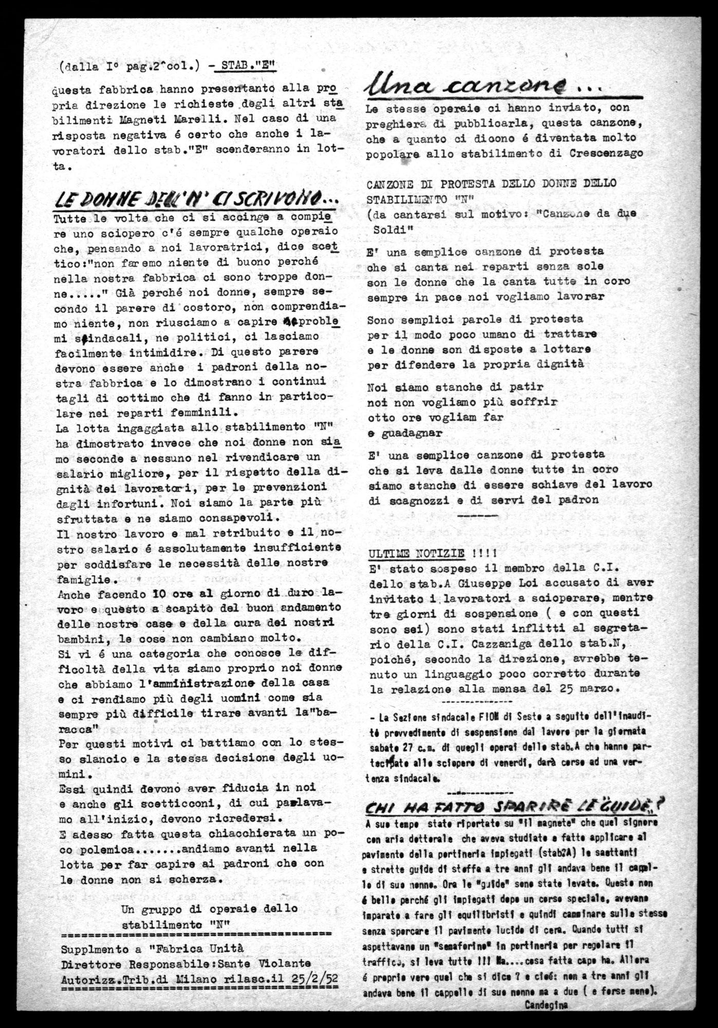 Le stesse operaie ci hanno inviato, con preghiera di pubblicarla, questa canzone, che a quanto ci dicono é diventata molto popolare allo stabilimento di Crescenzago