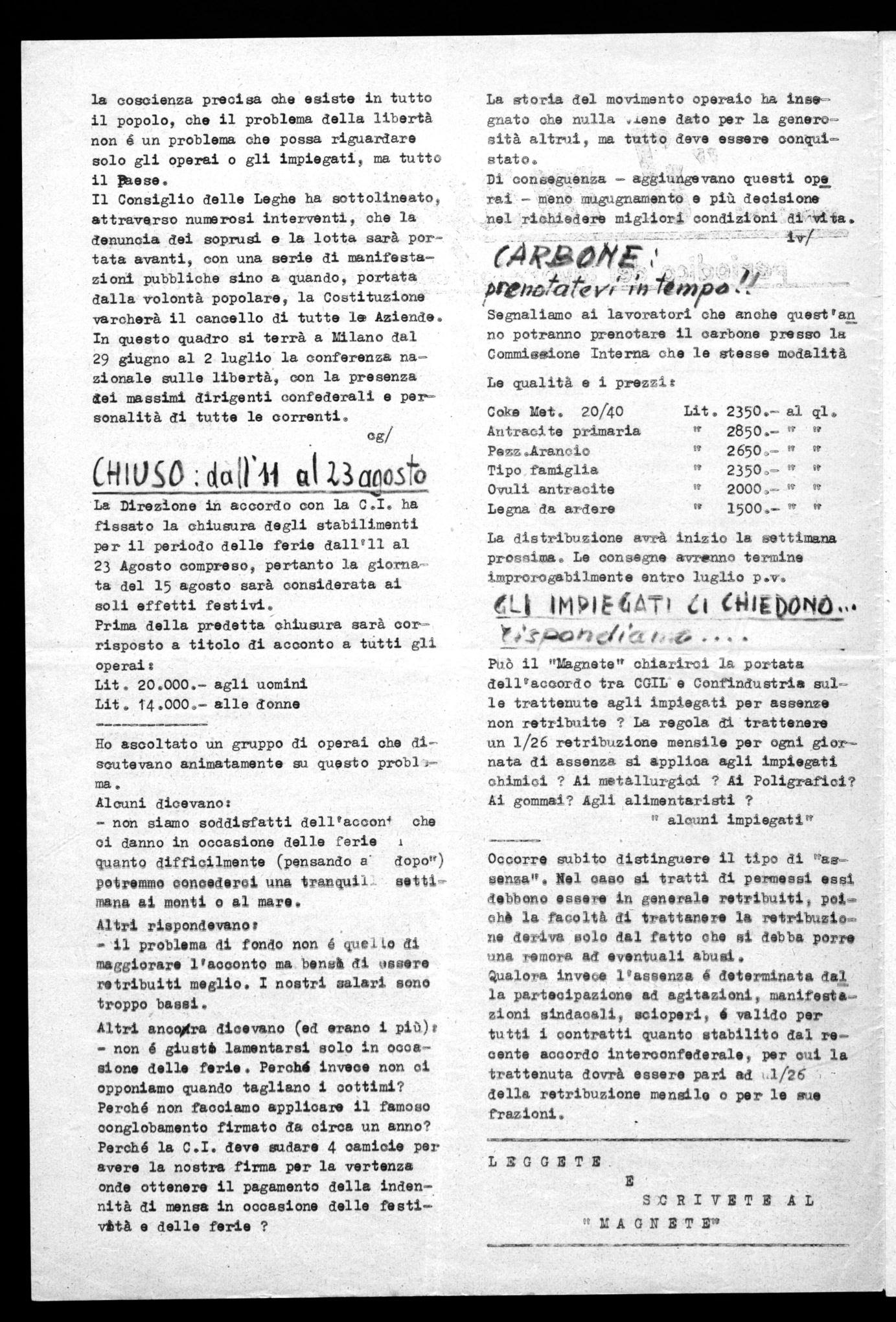 Come rileverete vi é una grande differenza fra il salario mensile degli operai della Magneti Marelli e quello da Voi polblicato, a meno che non abbiate voluto dire che uno operaio, per mantenere dignitosamente la propria famiglia, deve percepire almeno Lit.70.000 ( Se cosi fosse concorderemmo senz'altro con la VostrU tesi.)