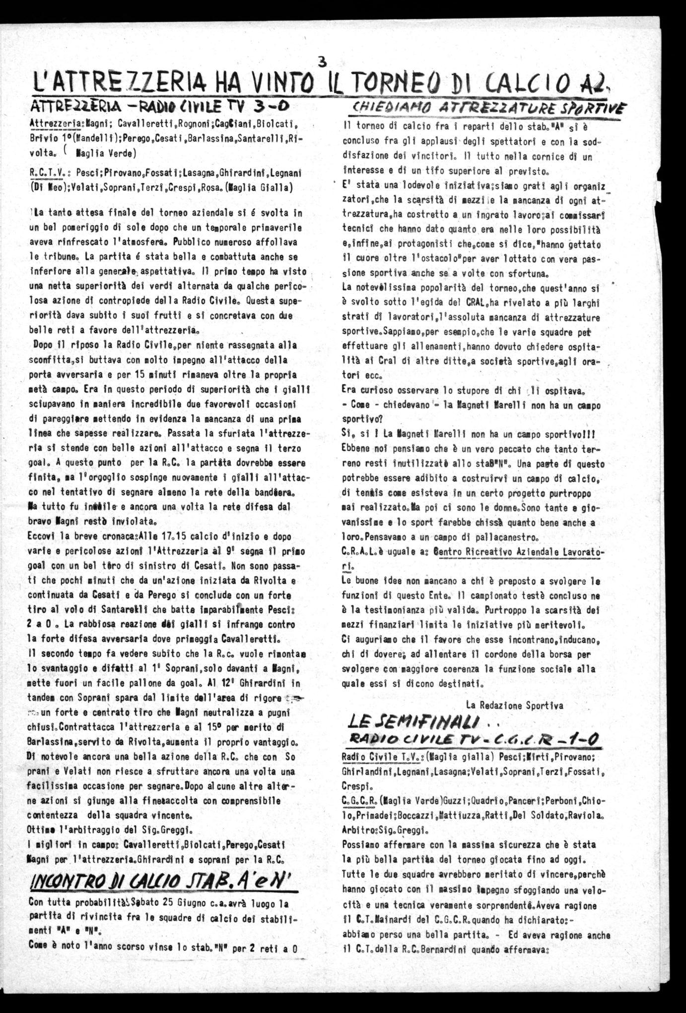La notevilissima popolarità del torneo,che quest'anno si • è svolto sotto l'egida del CRAL,ha rivelato a più larghi strati di lavoratori,l'assoluta mancanza di attrezzature sportive.Sappiamo,per esempio,che le varie squadre pef effettuare gli allenamenti,hanno dovuto chiedere ospitalità ai Cral di altre ditte,a società sportive,agli oratori ecc.