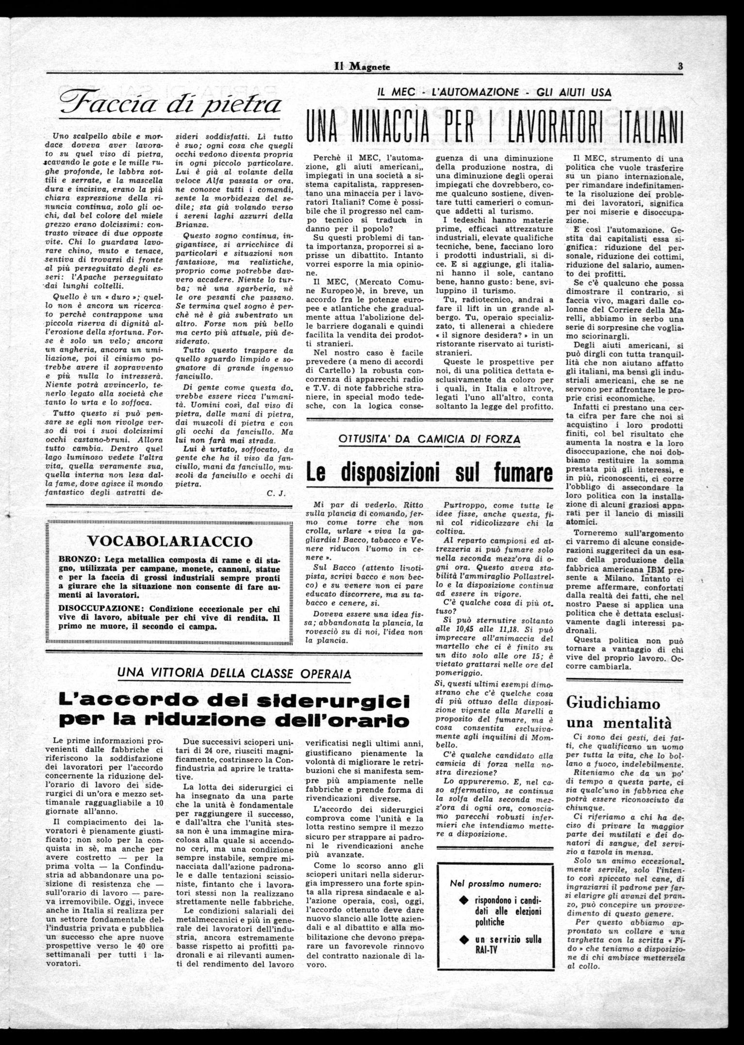 Cercate di capirli questi membri della classe dirigente: sino a pochi anni fa quell'arma formidabile che è la stampa era loro monopolio assoluto in tutto il Paese, e oggi... oggi si vedono giungere in fabbrica « Il Magnete ».
