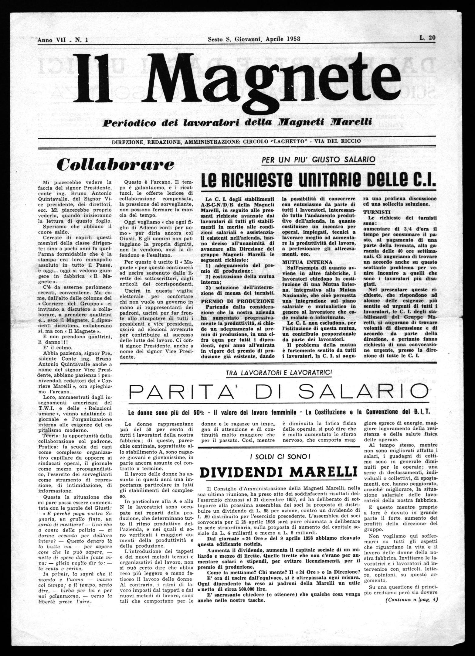 Caro Magnete, ho saputo con piacere della decisione di stampare il giornaletto dei lavoratori della Magneti Marelli e ne approfitto per scriverti quanto segue.