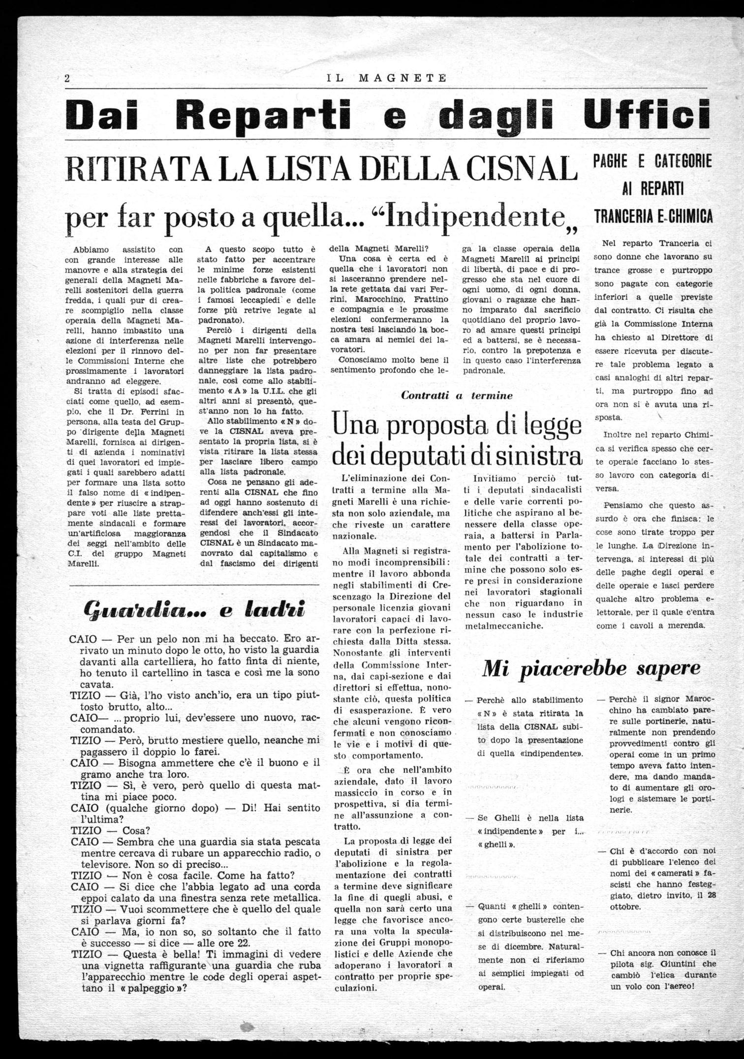 Abbiamo assistito con con grande interesse alle manovre e alla strategia dei generali della Magneti Mareni sostenitori della guerra fredda, i quali pur di creare scompiglio nella classe operaia della Magneti Marelli, hanno imbastito una azione di interferenza nelle elezioni per il rinnovo delle Commissioni Interne che prossimamente i lavoratori andranno ad eleggere.