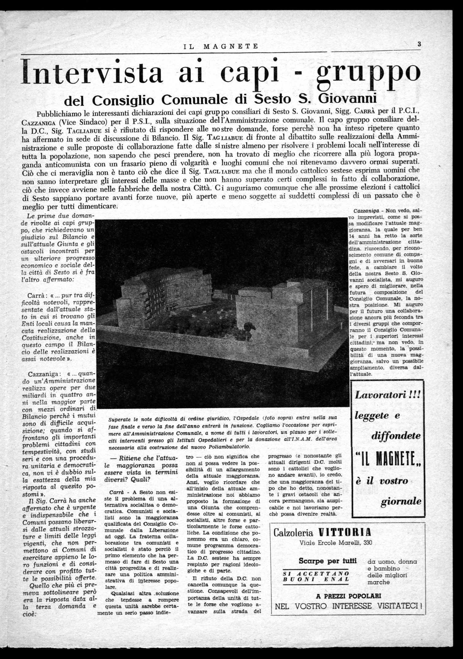 Pubblichiamo le interessanti dichiarazioni dei capi gruppo consiliari di Sesto S. Giovanni, Sigg. CARRI per il P.C.I., CAZZANIGA (Vice Sindaco) per il P.S.I., sulla situazione dell'Amministrazione comunale. Il capo gruppo consiliare della D.C., Sig. TAGLIABUE Si è rifiutato di rispondere alle no stre domande, forse perchè non ha inteso ripetere quanto ha affermato in sede di discussione di Bilancio. Il Sig. TAG LIABUE di fronte al dibattito sulle realizzaioni della Amministrazione e sulle proposte di collaborazione fatte dalle si nistre almeno per risolvere i problemi locali nell'interesse di tutta la popolazione, non sapendo che pesci prendere, non ha trovato di meglio che ricorrere alla più logora propaganda anticomunista con un frasario pieno di volgarità e luoghi comuni che noi ritenevamo davvero ormai superati. Ciò che ci meraviglia non è tanto ciò che dice il Sig. TAGL IABUE ma che il mondo cattolico sestese esprima uomini che non sanno interpretare gli interessi delle masse e che non hanno superato certi complessi in fatto di collaborazione, ciò che invece avviene nelle fabbriche della nostra Città. C i auguriamo comunque che alle prossime elezioni i cattolici di Sesto sappiano portare avanti forze nuove, più aperte e meno soggette ai suddetti complessi di un passato che è meglio per tutti dimenticare.