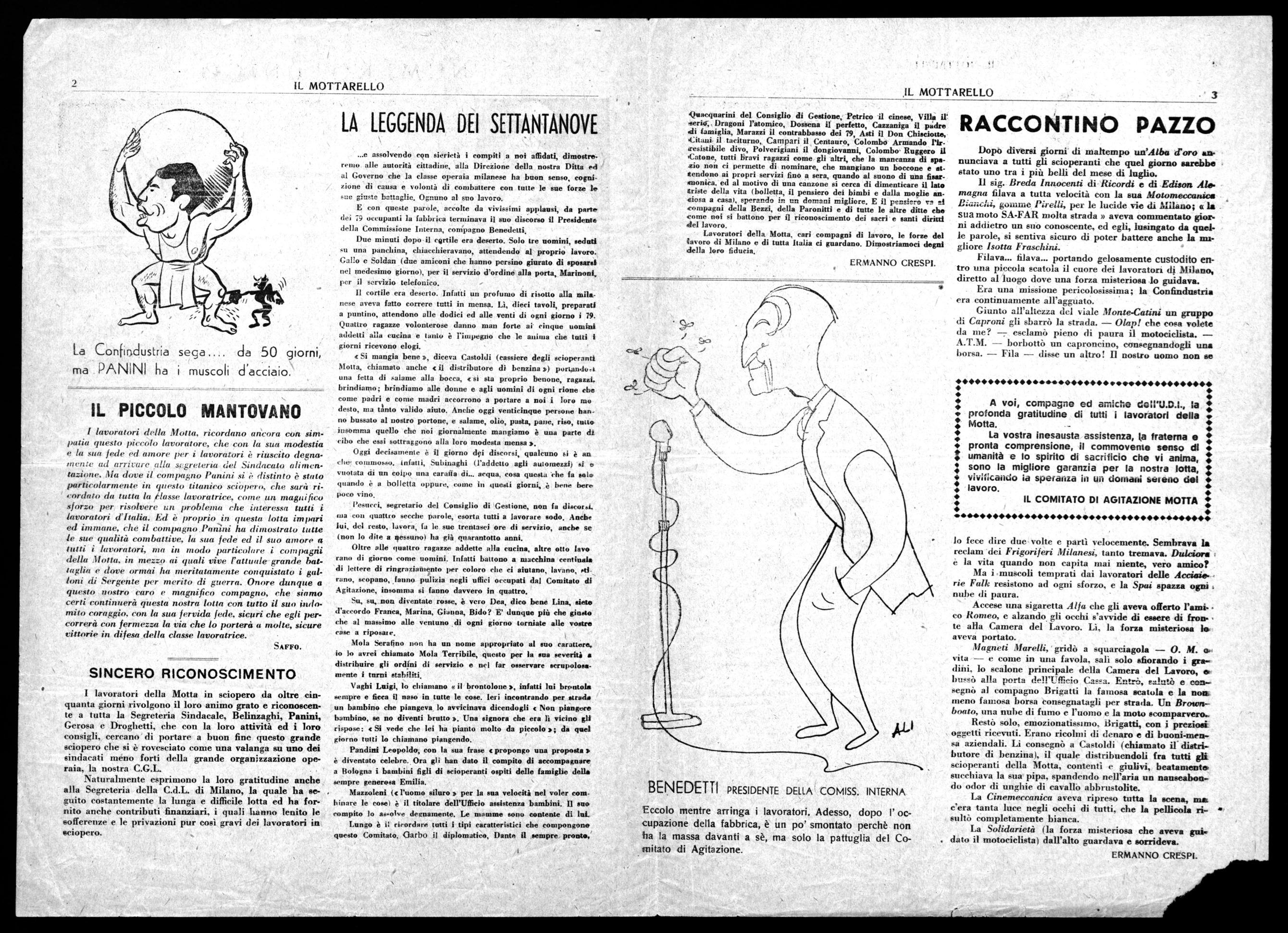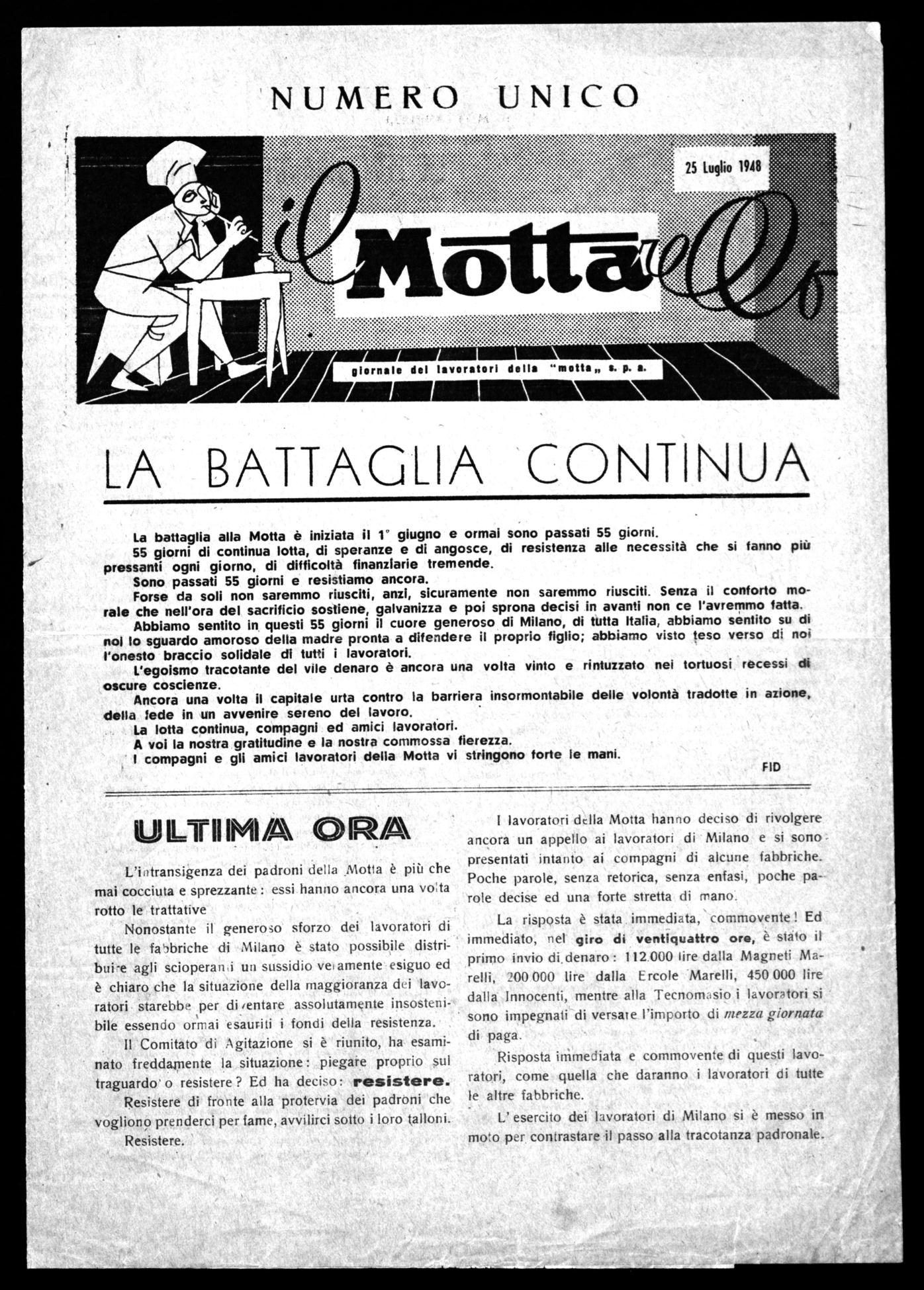 I lavoratori della Motta in sciopero da oltre cinquanta giorni rivolgono il loro animo grato e riconoscente a tutta la Segreteria Sindacale, Belinítighi, Panini, Gerosa e Droghetti, che con la loro attività ed i loro consigli, cercano di portare a buon fine questo grande sciopero che si è rovesciato come una valanga su uno dei sindacati meno forti della grande organizzazione operaia, la nostra C.G.L.