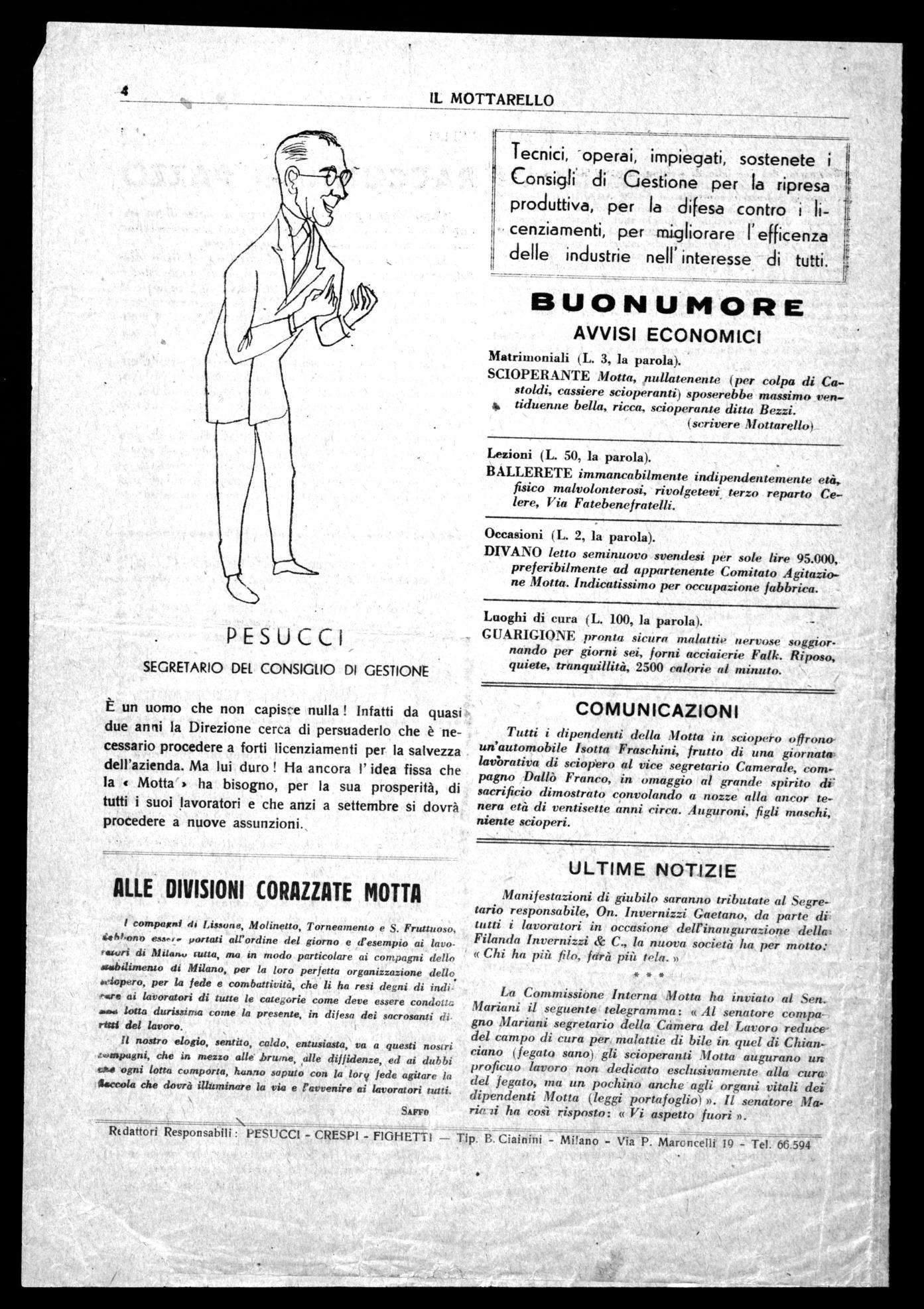È un uomo che non capisce nulla ! Infatti da quasi due anni la Direzione cerca di persuaderlo che è necessario procedere a forti licenziamenti per la salvezza dell'azienda. Ma lui duro ! Ha ancora I' idea fissa che la e Motta ha bisogno, per la sua prosperità, di tutti i suoi lavoratori e che anzi a settembre si dovrà procedere a nuove assunzioni.