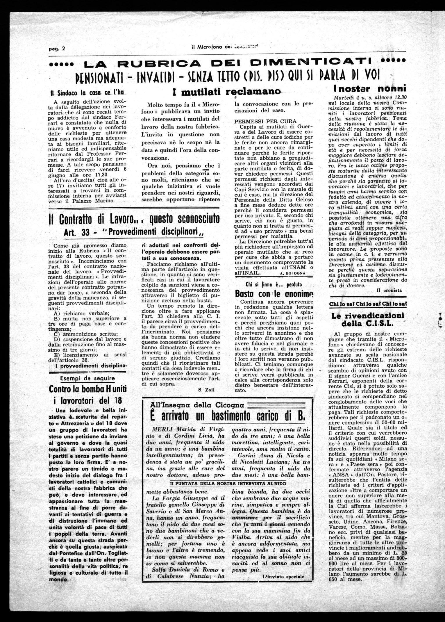 Da molto tempo la grossa famiglia della Geloso ha degli ospiti laboriosi e simpatici che per la particolare natura della loro attività suscitano il nostro interesse... interessato. Sono i bravi muratori che ci hanno costruito la mensa e stanno portando a termine il cral, lo spaccio e il nido. Giorno 19 u. s. vi è stato lo sciopero della loro categoria ed abbiamo assistito con piacere ed ammirazione all'unità ed alla totalità con cui questi nostri compagni occasionali di lavoro hanno risposto all'appello della grande C.G.I.L. Bravi amici muratori, i lavoratori e le lavoratrici della Geloso sono lieti di avervi vicini di lavoro e vi mandano attraverso il loro giornale di fabbrica « Il Microfono » il loro plauso ed il loro fraterno saluto. GIANNI