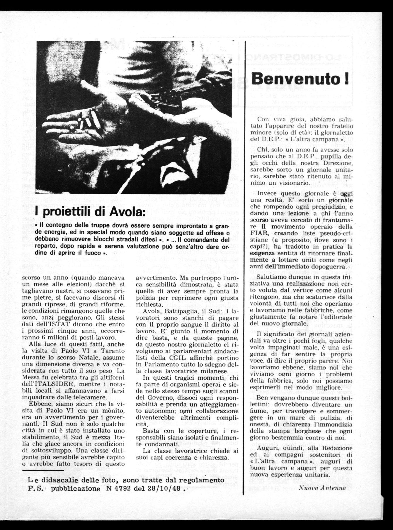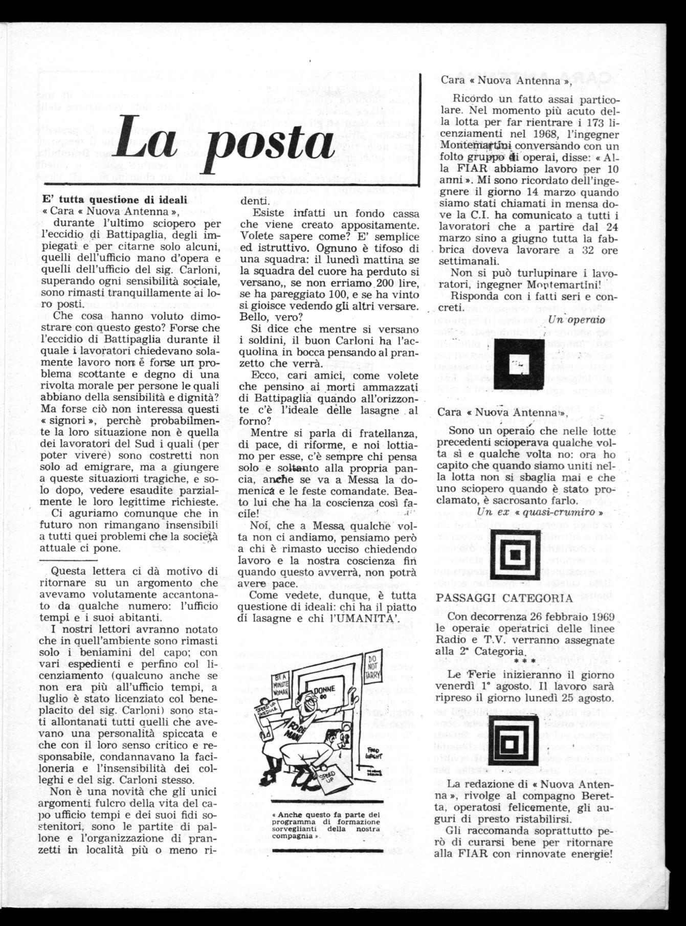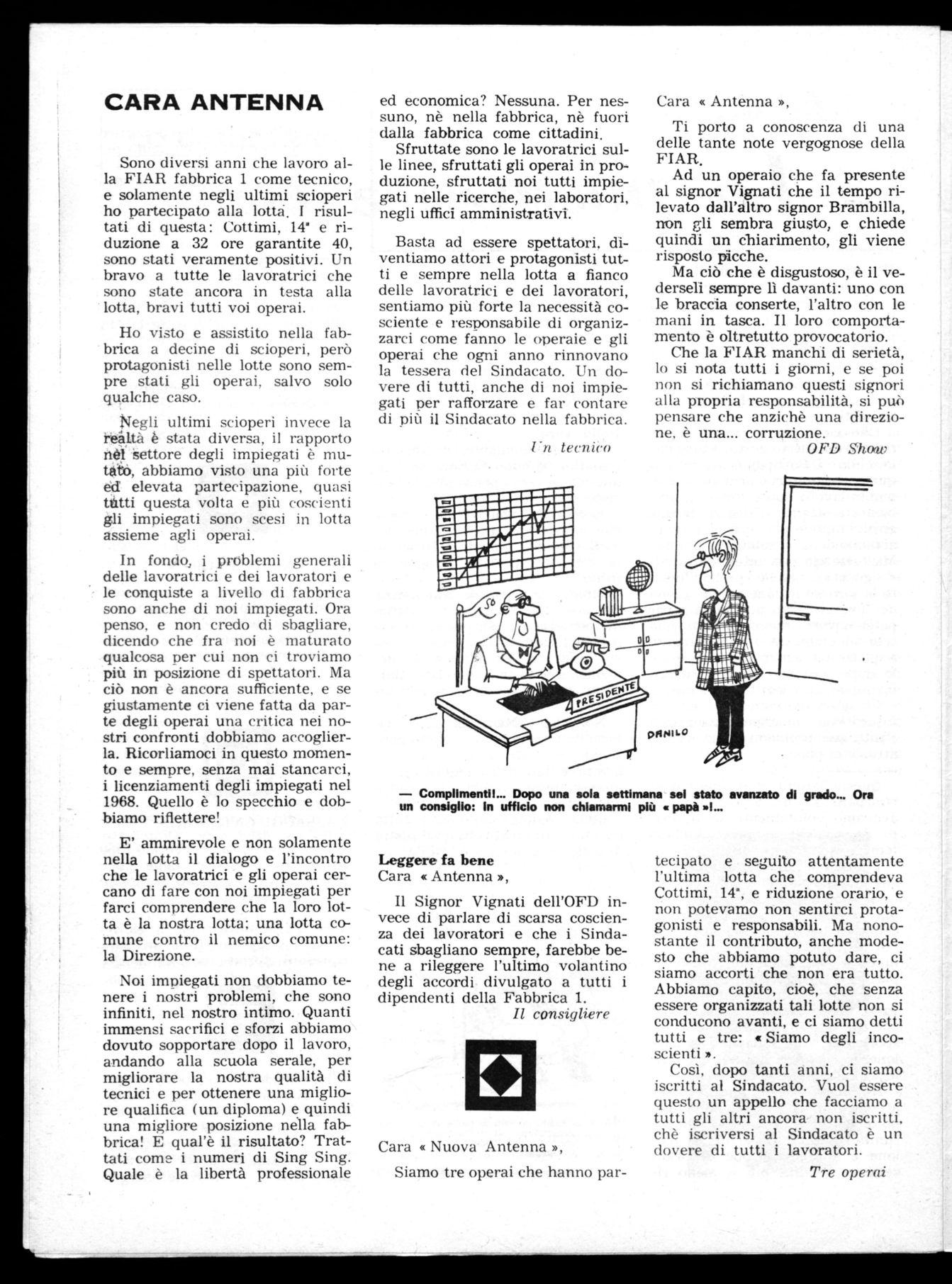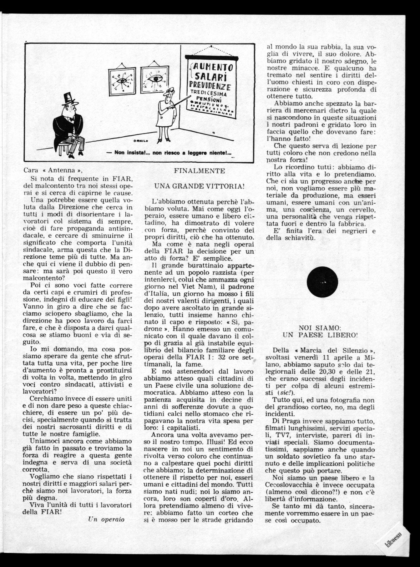 Cara « Nuova Antenna'», Sono un operaio che nelle lotte precedenti scioperava qualche volta sì e qualche volta no: ora ho capito che quando siamo uniti nella lotta non si sbaglia mai e che uno sciopero quando è stato proclamato, è sacrosanto farlo.