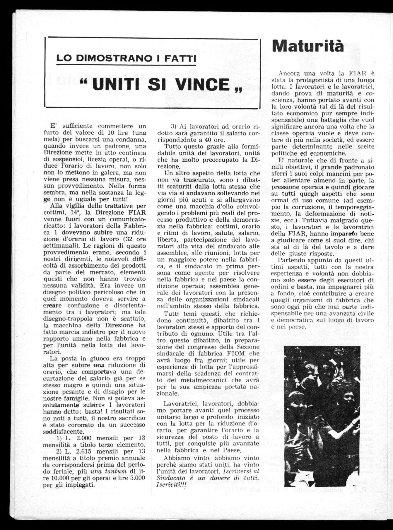 Sono diversi anni che lavoro alla FIAR fabbrica 1 come tecnico, e solamente negli ultimi scioperi ho partecipato alla lotta. I risultati di questa: Cottimi, 14' e riduzione a 32 ore garantite 40, sono stati veramente positivi. Un bravo a tutte le lavoratrici che sono state ancora in testa alla lotta, bravi tutti voi operai.