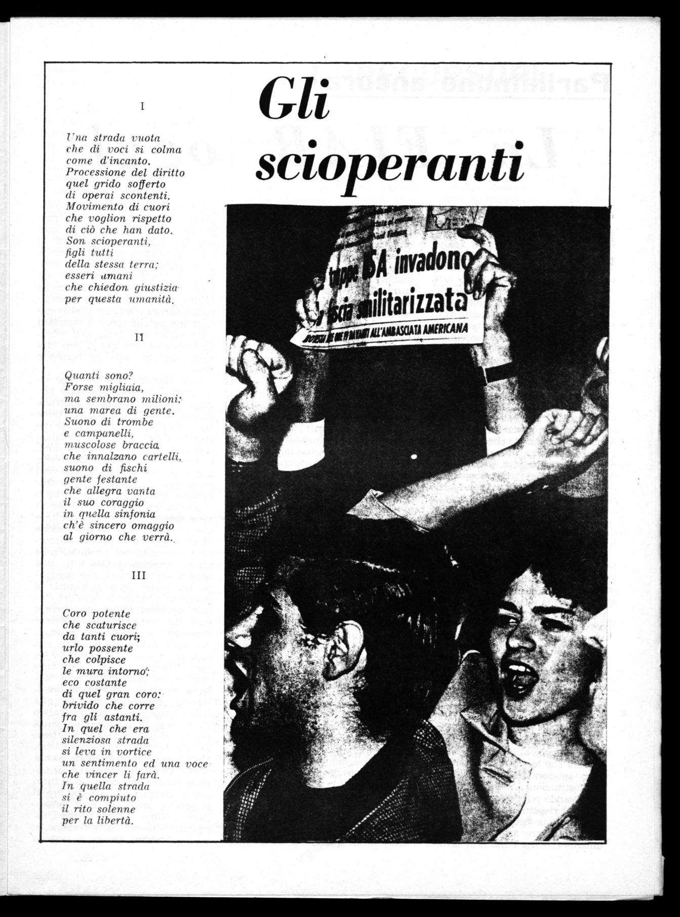 Anni fa nella lotta per la liberazione morivano giovani e vecchi, operai, impiegati e dottori, oggi si vive la lotta per la giustizia, per la dignità. Qualcuno a questa lotta è diventato superiore; instupidito del sistema che lo vuole strumentalizzato, ignorante e senza potere, paventando un atteggiamento da borghese da strapazzo, fa un sorrisino ebete agli scioperi, non sapendo che dovrebbe piangere della sua disperata condizione. Anni fa si combatteva per una Patria il cui ideale era stato svuotato, travisato, calpestato nei suoi tratti più umani. Il 25 Aprile vuol ricordare una Patria nuova, dove si lotta per la dignità d'ognuno e per la libertà, una Patria in cui non si sia liberi solo di morire, o di vedersi carosello, ma dove ritornino validi i concetti di responsabilità, di partecipazione diretta alla guida dello Stato e assumano giusta dimensione i nuovi concetti di bisogni e di pace.