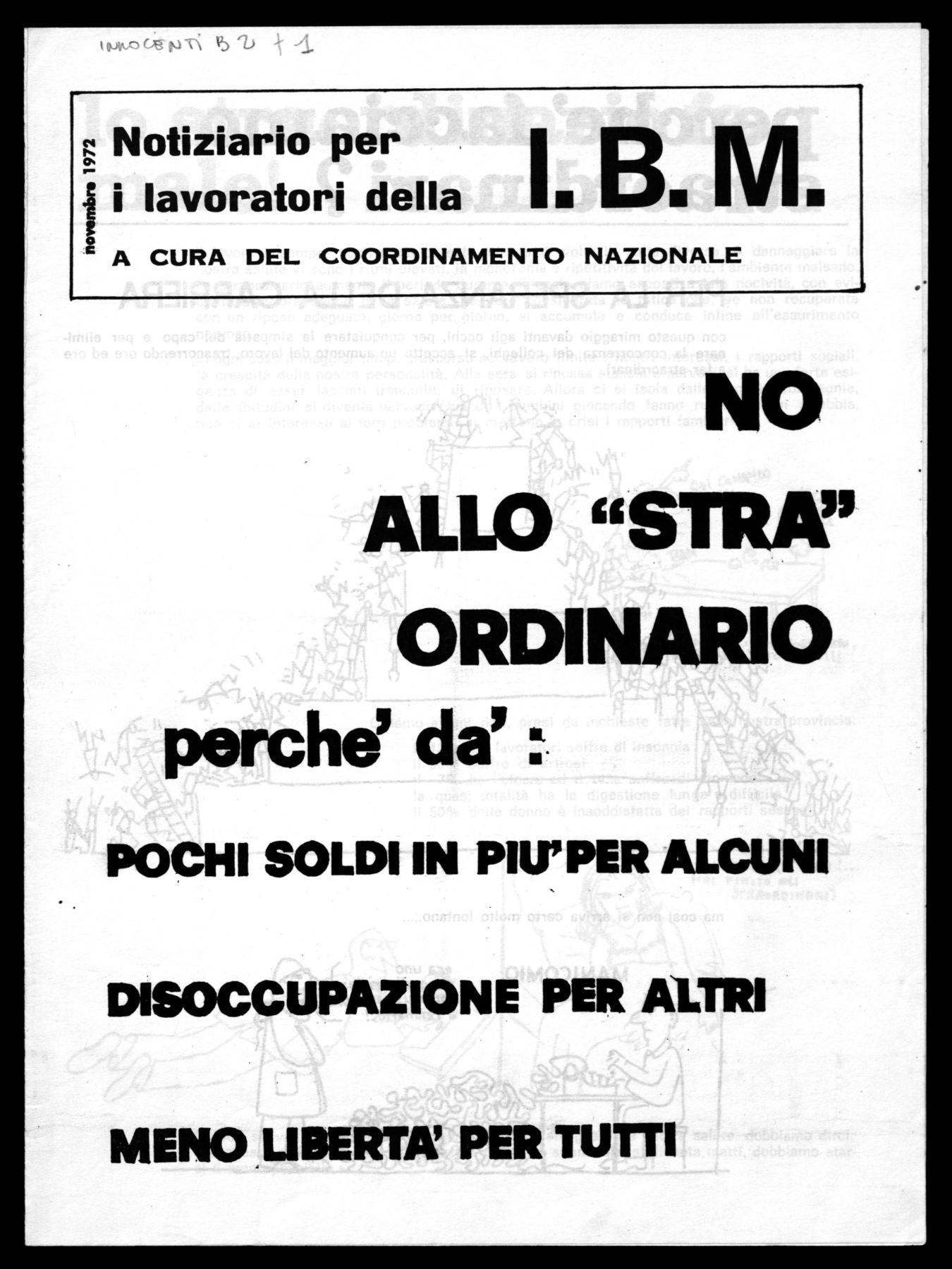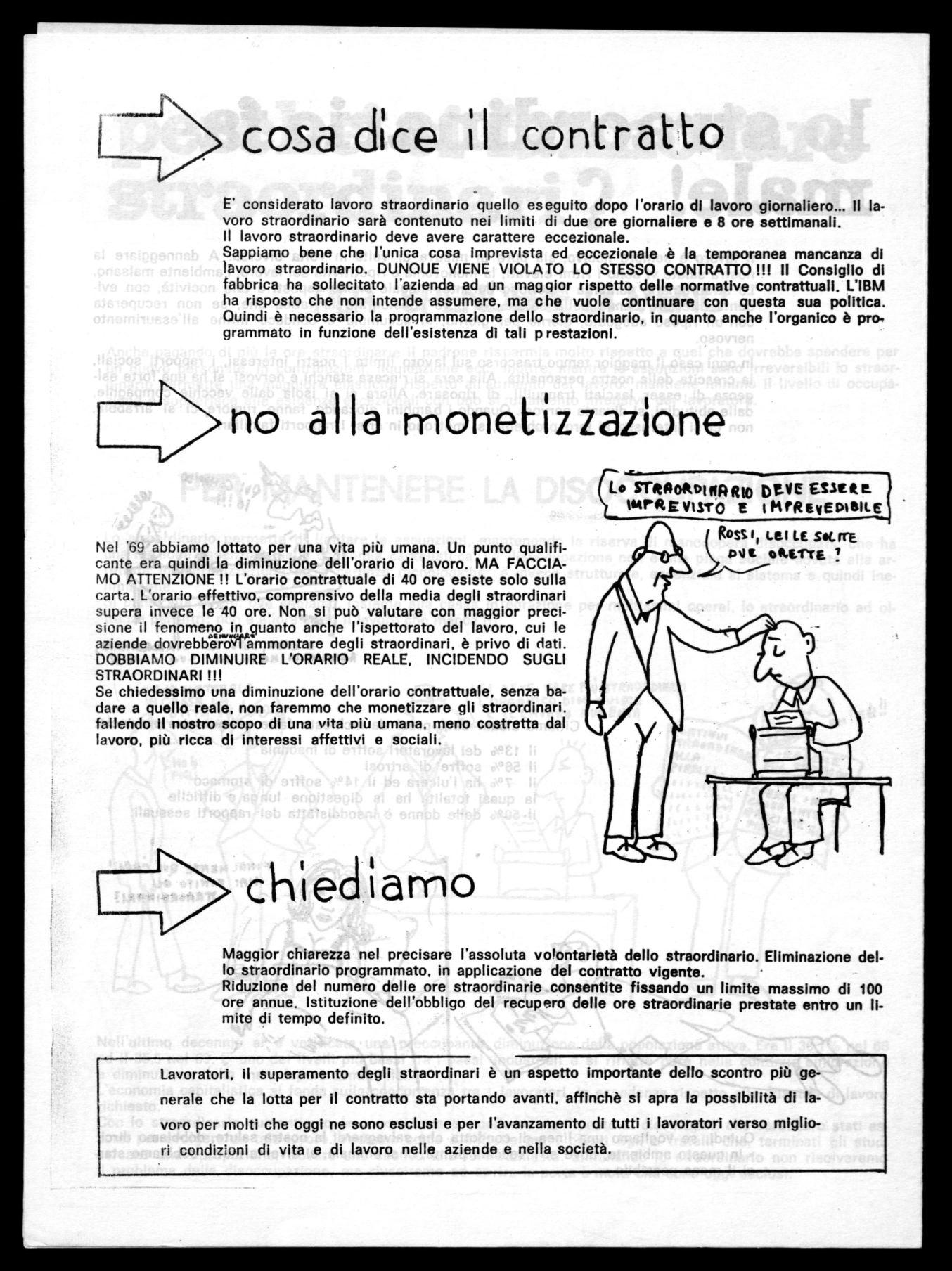 E considerato lavoro straordinario quello eseguito dopo l'orario di lavoro giornaliero... Il lavoro straordinario sarà contenuto nei limiti di due ore giornaliere e 8 ore settimanali. Il lavoro straordinario deve avere carattere eccezionale. Sappiamo bene che l'unica cosa imprevista ed eccezionale è la temporanea mancanza di lavoro straordinario. DUNQUE VIENE VIOLATO LO STESSO CONTRATTO !!! Il Consiglio di fabbrica ha sollecitato l'azienda ad un maggior rispetto delle normative contrattuali. L'IBM ha risposto che non intende assumere, ma che vuole continuare con questa sua politica. Quindi è necessario la programmazione dello straordinario, in quanto anche l'organico è programmato in funzione dell'esistenza dì tali p restazioni.