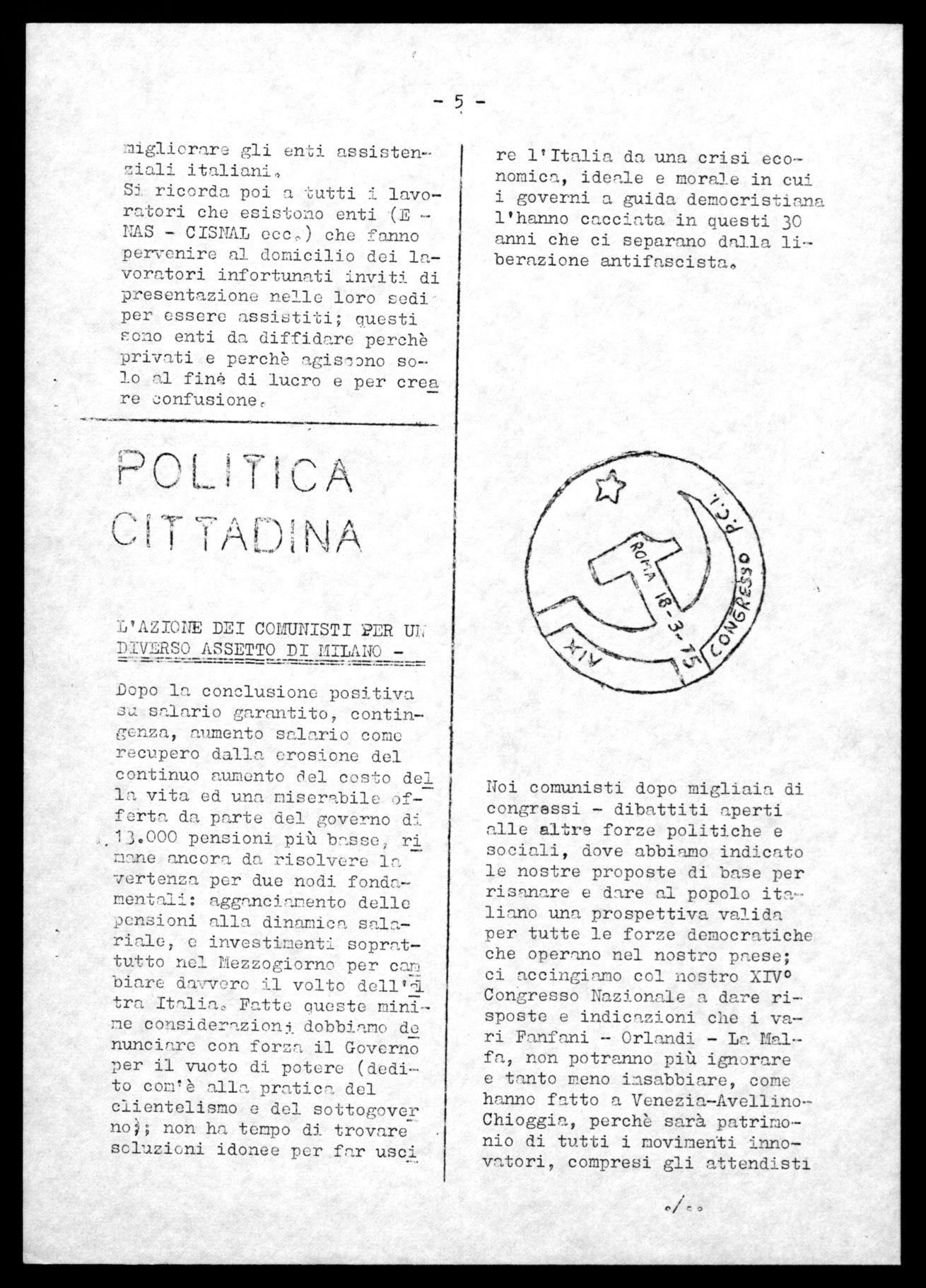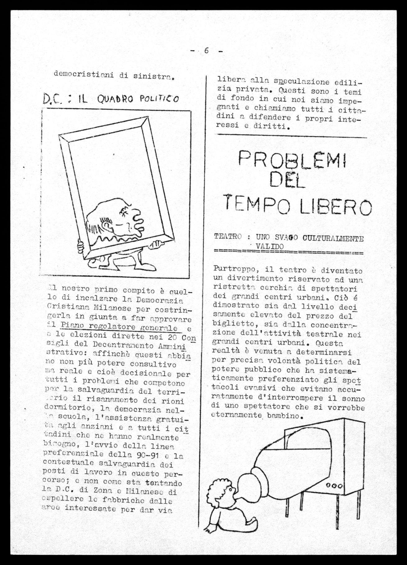 T1 nostro primo compito è ouello di incalzare la Democrazia Cristiana Milanose per costringerla in giunta a far approvare il Piano regolatore generale e e le elezioni dirette nei 20 Con sigli del Decentranento Ammini strativo: affinchè Questi abbia no non più potere consultivo ma reale e cioè decisionale per tutti i problemi che competono par la salvaguardia del torririo il risanamento dei rioni dormitorio, la democrazia nel'^ scuola, l'assistenza gratuit agli anziani e n tutti i cit ladini che ne hanno realmente bi7,ogno, l'avvio della linea preferenziale della 90-91 e la contestuale salvaguardia dei posti di lavoro in ouesto percorso; e non cono sta tentando la D.C. di Zona e Milanese di espellere le fabbriche dalle ree: interessate per dar via