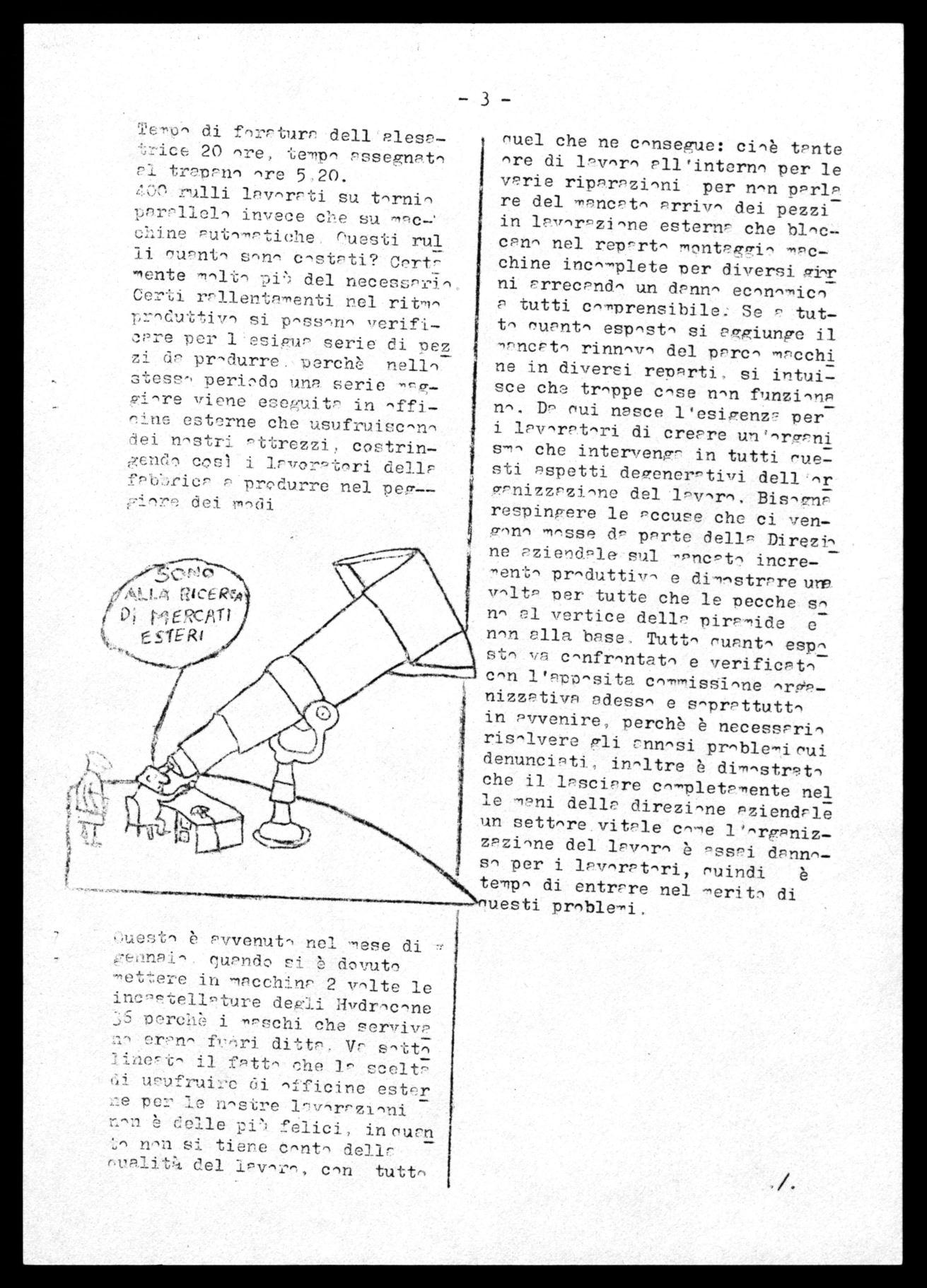 nuel che ne cnnsegue: cioè tante are di lnvnrn all'interna per le vPrie ripPrPzinni per non pPr1P re del mgnePtn Prrivn dei pezzi in 1Pvnr.Pzinne esterni che blnccann nel repertn mentPxl.gin acchine incn-Tlete per diversi Frinr ni arrecando un danna ecnnnmicn a tutti cnmprensibile: Se r tuttn nwintn espnstn si aRgiunpe il mrncatn rinnnvn del parc- macchi ne in diversi reparti, si intuisce che trappe case non funziona nn. D^ rui nasce l'esigenza per i lrvnratnri di creare un'nrp .rni s-In che intervenga - in tutti ruesti aspetti degenerativi dell - »r ganizzrzinne del lavnrn. BisnrnF7 respinpere le accuse che ci vengnnn masse da parte della Direzin ne rziendale-sul -ancatn increprnduttivn e dimnstrrreure vnita per tutte che le pecche sn nn el vertice della piramide e nnn alla base, Tutti ruantn esp' sta va cnnfrnntetne verificatacan l'app^sita enmmisSinne nrrìanizzativa adesso e s -prrttuttn in avvenire, perchè è necessrrin ris^lvere gli annnsi prnblemieui denunciati, in-ltre è dimnstratn che il lasciare cnmpletrmente nel le mani della direzinne azienda-l; un settore. vit=ale come 1"^rganizzazinne del lavar' è assai dannnsn per i lavnratnri, ruindi è tempa di entrare nel merita di ,uesti prnble-0i.