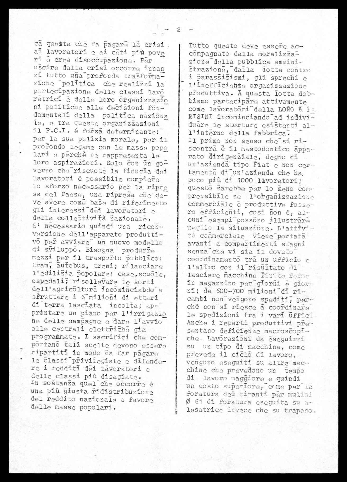 Tutto questo deve essere accompagnato dalla MoralizZatlzionedella pubblica amminigtrazione,daila lotta contro 5 parassitismi, gli sprecai e rinefficiebte organizzazione pi;oduttiva. A questa lotta dobbiamo partecipare attivamente come laVorató -ridella LORO & RISINI incominciando adindivi duare le storture esistenti agl'interno della fabbrica;Il primo n6n senso che-si riscontra é il Mastodontico appa rato dirigenziale, degno di un'azjenda tipo Fiat e non certamente diTun'azienda che Ea, poco più di 1000 lavoratori; questó sarebbe per lo Meno comprensibile se l'ol-ganizzaziomP commerciale e produttive fossero(ifficenti, così non é, a2cnn5 -esempi-possóno illustrare la gituazìane, L'attiv coanerciale ,iene-portata avanti a coMpartiMenti stagni senza-che vi sia il dovuto coordinaLent6 tra un ufficio e l'altro con 11risfdtato lasciare Macchine in magazzino per - giorni e gic, ni; da 600-700 milioni-di ricambi non vengonospediti; perchè non-si riesce à cooi;dinal .e le spedizioni trai vari tiffic-I Anche i reparti_ produttivi p35esentano deficienze macrosopiche, Lavórazi6ni daeseguirsi su un tipo di macchina, come prevede il ciC16 c7. .1 lavoro, vengono eseguiti su altre macchine che prevedono un tempo di lavoro :,agd':oro e quindi un costo superiore,-ce ire per- La foratura dei tiranti