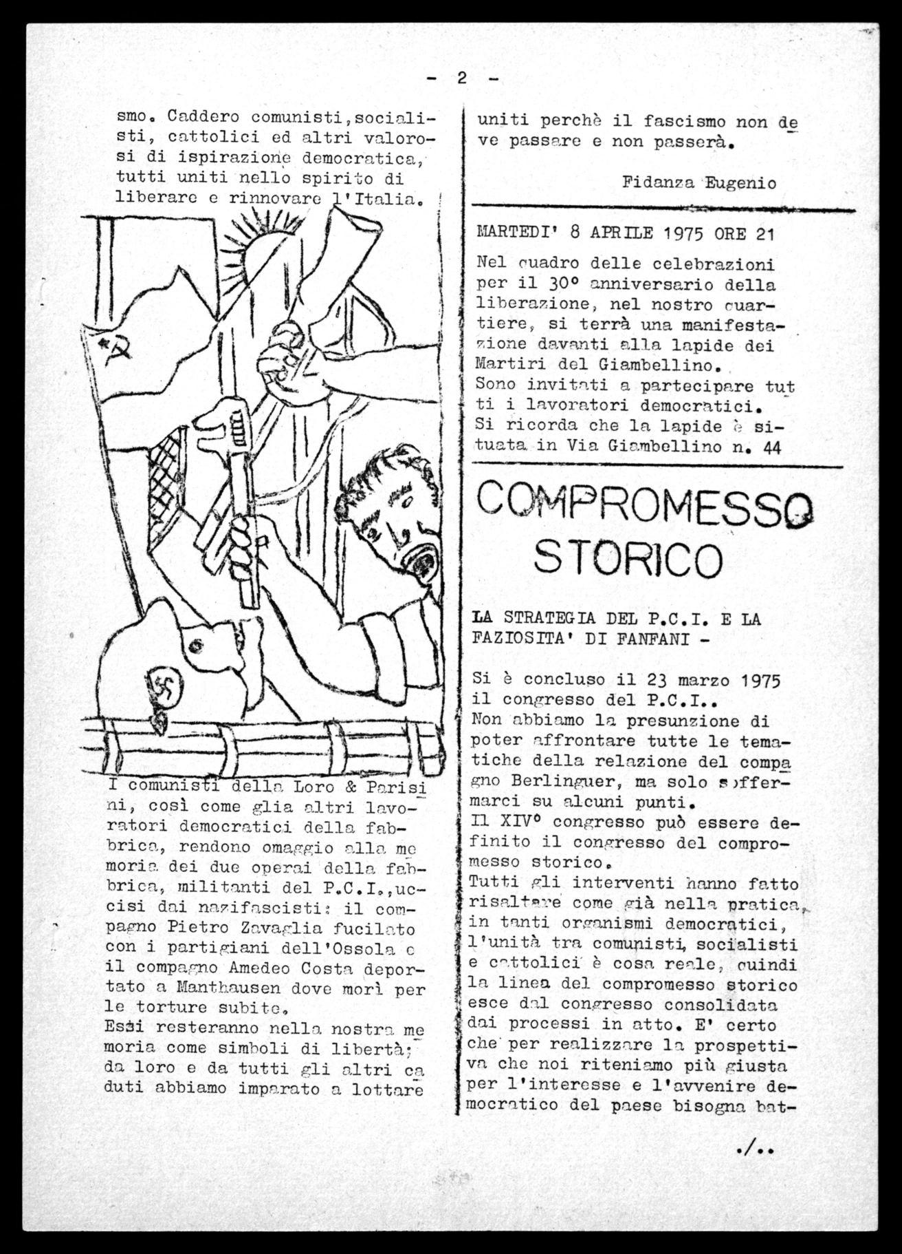 ni, così come glia altri lavoratori democratici della fabbrica, rendono omaggio alla me moria dei due operai della fabbrica, militanti del P.C.I.,uccisi dai nazifascisti il compagno Pietro Znvaglia fucilato con i partigiani dell'Ossola il compagno Amedeo Costa deportato a Manthausen dove morì per le torture subite.