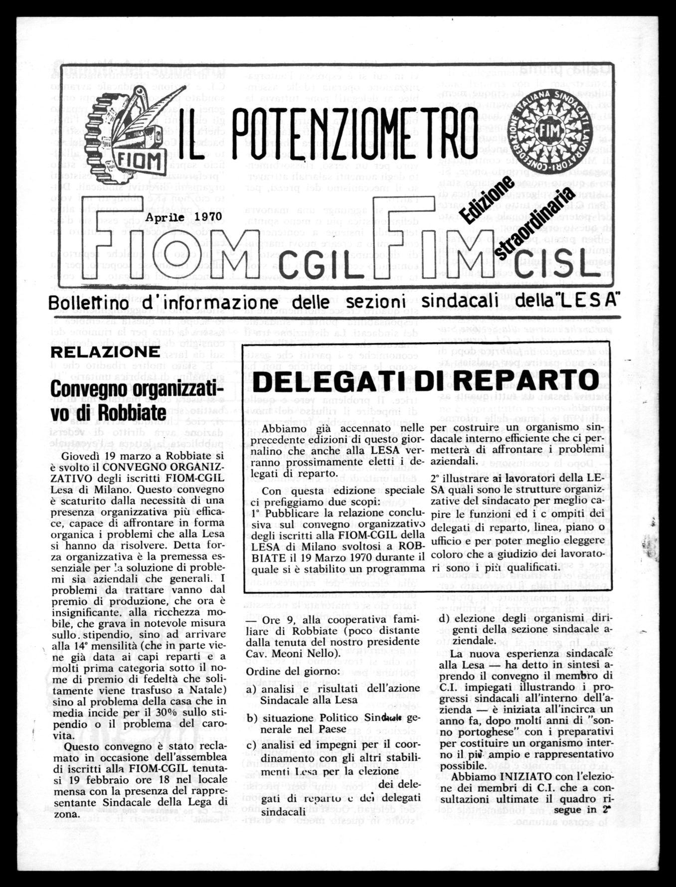 1° Pubblicare la relazione conclusiva sul convegno organizzativa degli iscritti alla FIOM-CGIL della LESA di Milano svoltosi a ROBBIATE il 19 Marzo 1970 durante il quale si è stabilito un programma