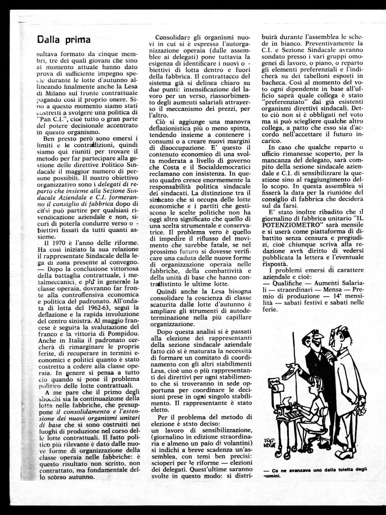 sultava formato da cinque membri, tre dei quali giovani che sino al momento attuale hanno dato prova di sufficiente impegno speLte durante le lotte d'autunno allineando finalmente anche la Lesa di Milano sul fronte contrattuale pagando così il proprio onere. Sino a questo momento siamo stati .,:,stretti a svolgere una politica di "Pan Ci", cioè tutto o gran parte del potere decisionale accentrato in questo organismo.
