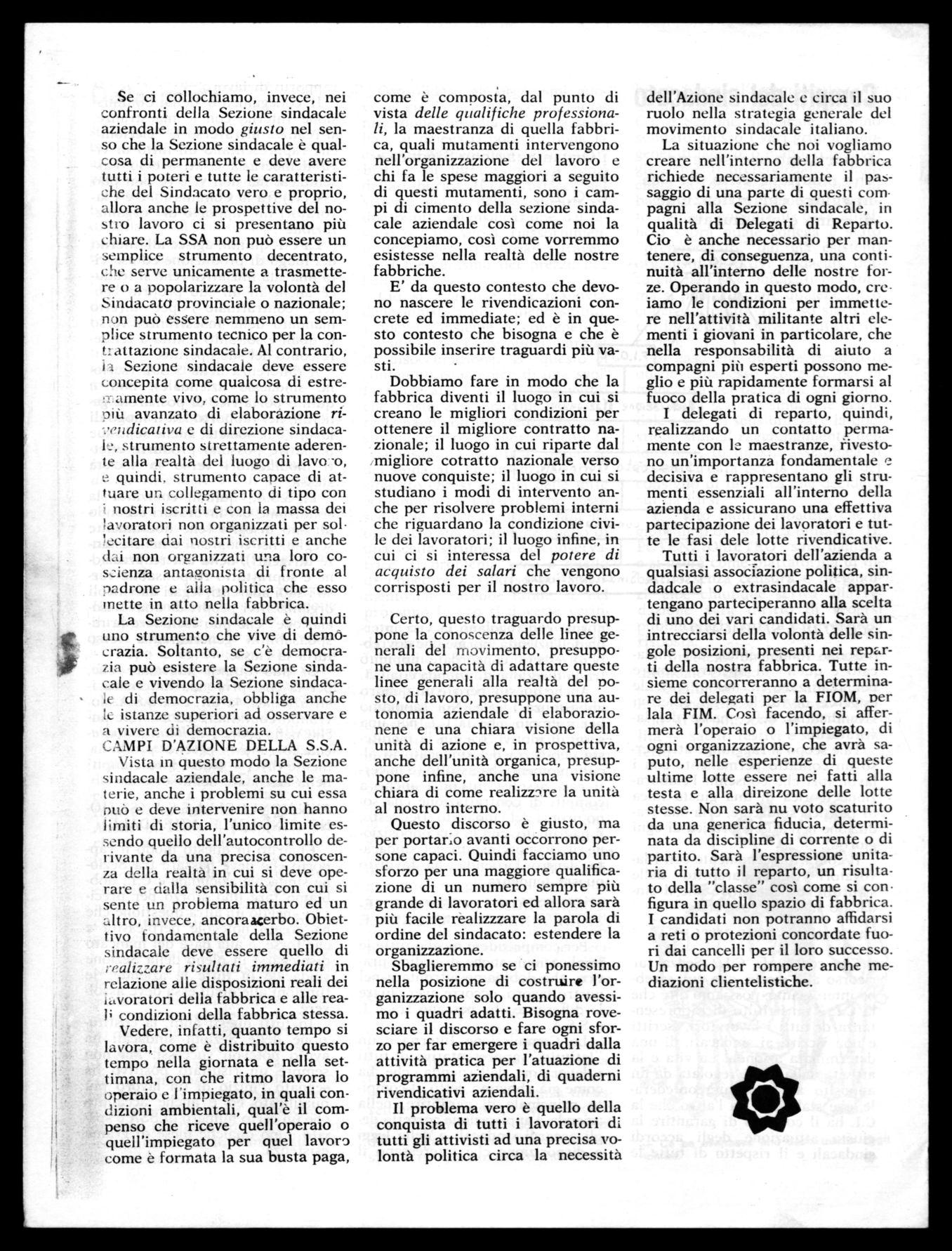 Tutti i lavoratori dell'azienda a qualsiasi associazione politica, sindadcale o extrasindacale appartengano parteciperanno alla scelta di uno dei vari candidati. Sarà un intrecciarsi della volontà delle singole posizioni, presenti nei reparti della nostra fabbrica. Tutte insieme concorreranno a determinare dei delegati per la FIOM, per lala FIM. Così facendo, si affermerà l'operaio o l'impiegato, di ogni organizzazione, che avrà saputo, nelle esperienze di queste ultime lotte essere nei fatti alla testa e alla direizone delle lotte stesse. Non sarà nu voto scaturito da una generica fiducia, determinata da discipline di corrente o di partito. Sarà l'espressione unitaria di tutto il reparto, un risultato della "classe" così come si configura in quello spazio di fabbrica. I candidati non potranno affidarsi a reti o protezioni concordate fuori dai cancelli per il loro successo. Un modo per rompere anche mediazioni clientelistiche.