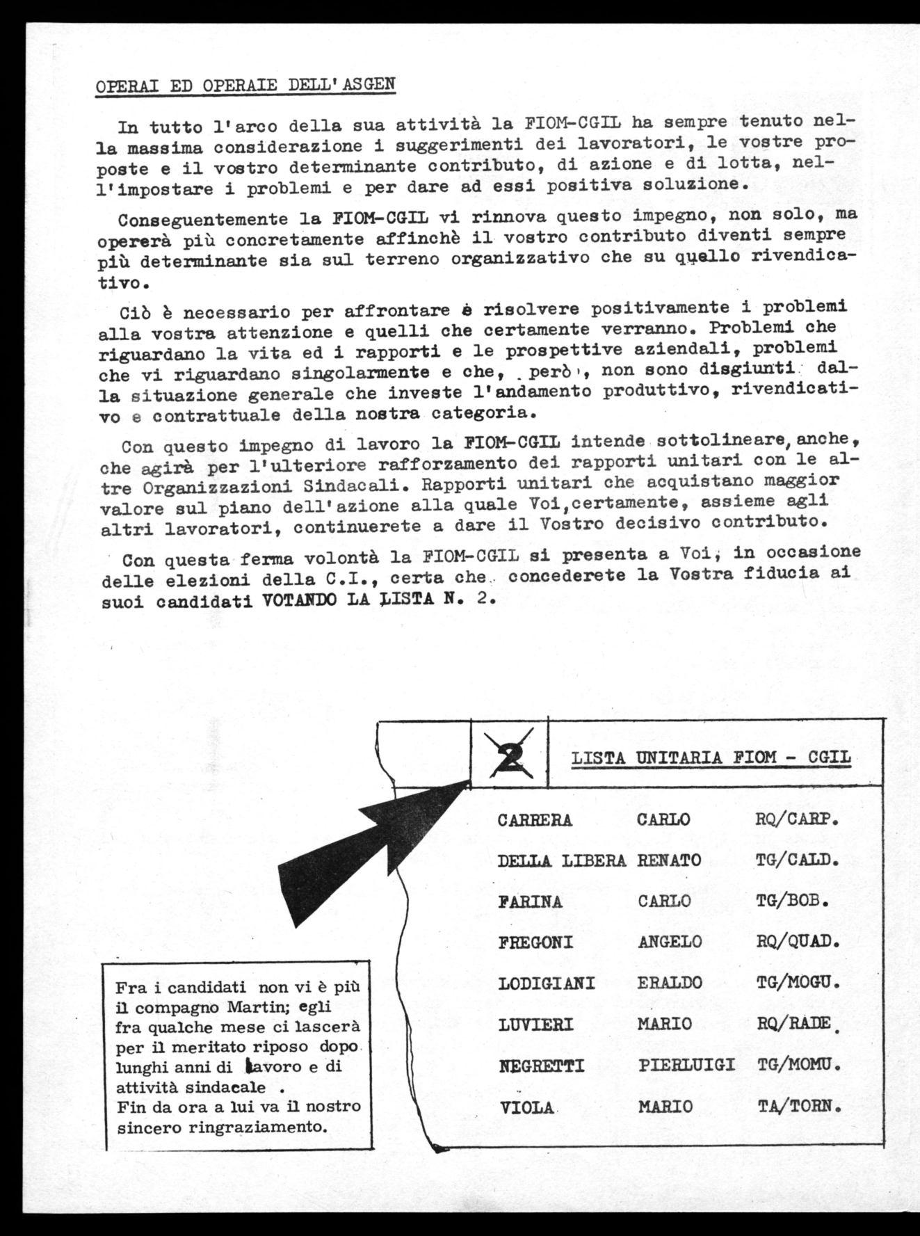 Per affrontare i problemi all'ASGEN, la FIOM pone alla Vostra atten zione ed alla Vostra scelta una lista di CANDIDATI che riteniamo quali ficati per dare un serio contributo, sia sul piano tecnico che su quel lo sindacale, per migliorare le Vostre condizioni di lavoro e, nel con tempo, dare un valido apporto per il rafforzamento della linea unitaria nei confronti della Direzione ASGEN.