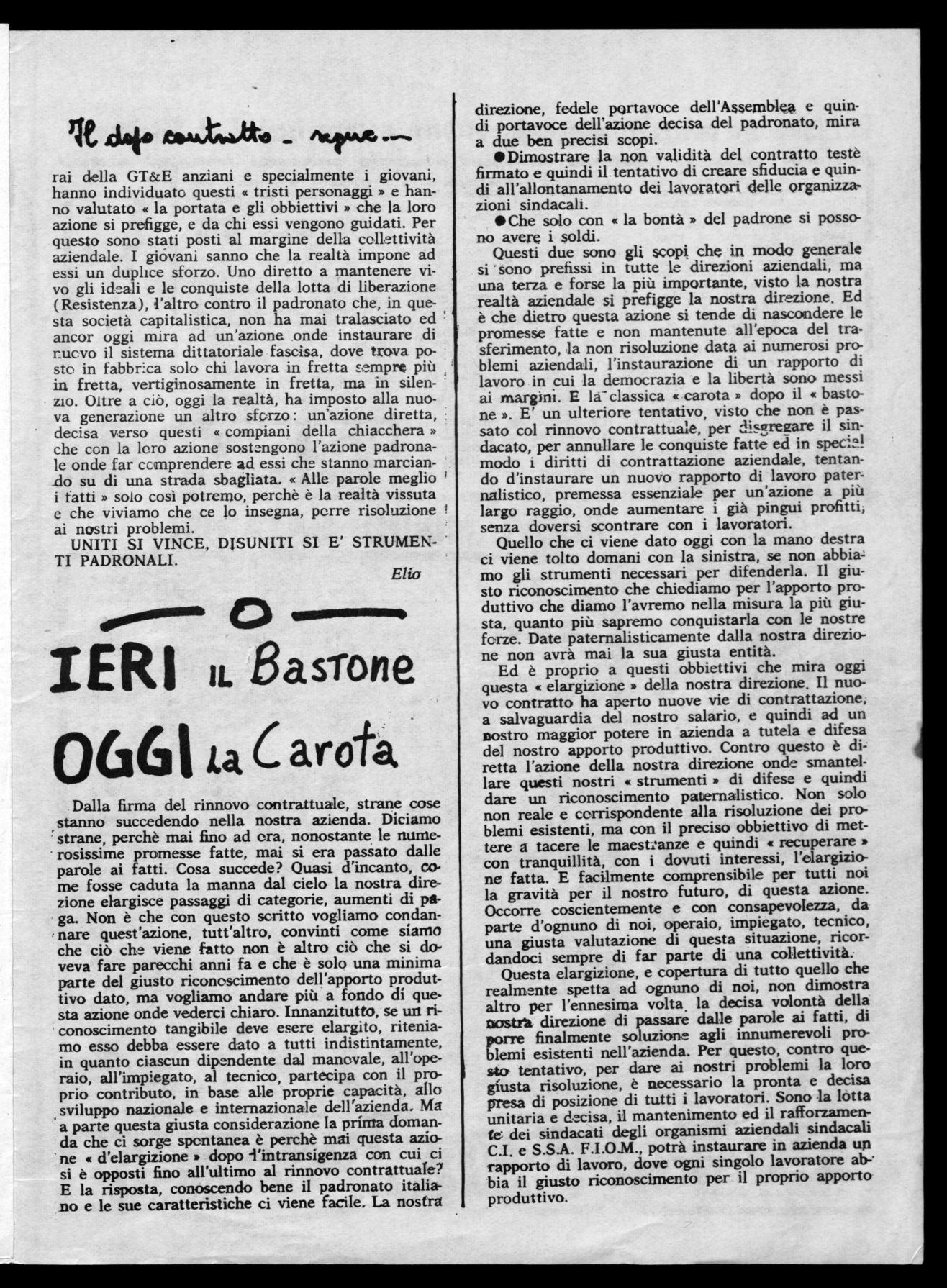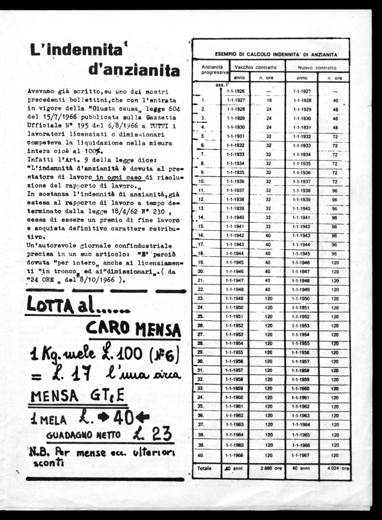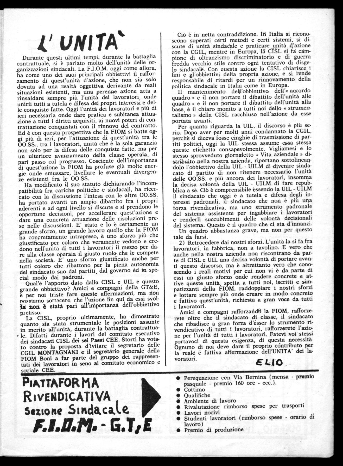 Perequazione con Via Bernina - (mensa - cottimi - qualifiche - premio 160 ore ecc.). Trasporti - ambiente di lavoro - servizi sociali assistenziali ecc. questi sono problemi che da anni aspettano una loro giusta risoluzione. Ma, Signori della Direzione, con le parole, non si dà ad essi una soluzione. Ci vogliono i fatti. E l'unico fatto dimostrato dalla vostra azione e che solo - la lotta di tutti i lavoratori della GT&E, può dare la giusta risoluzione a questi problemi,