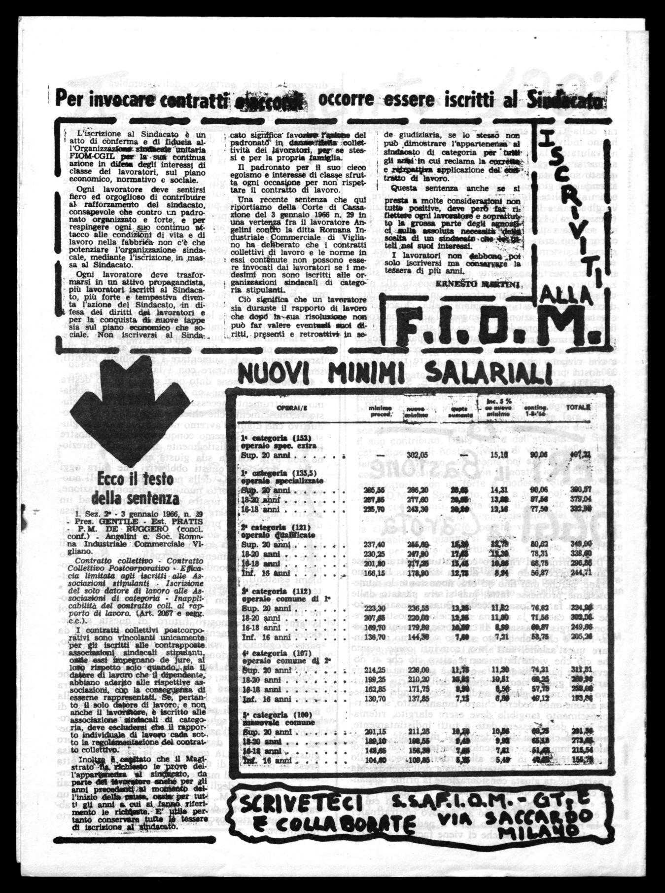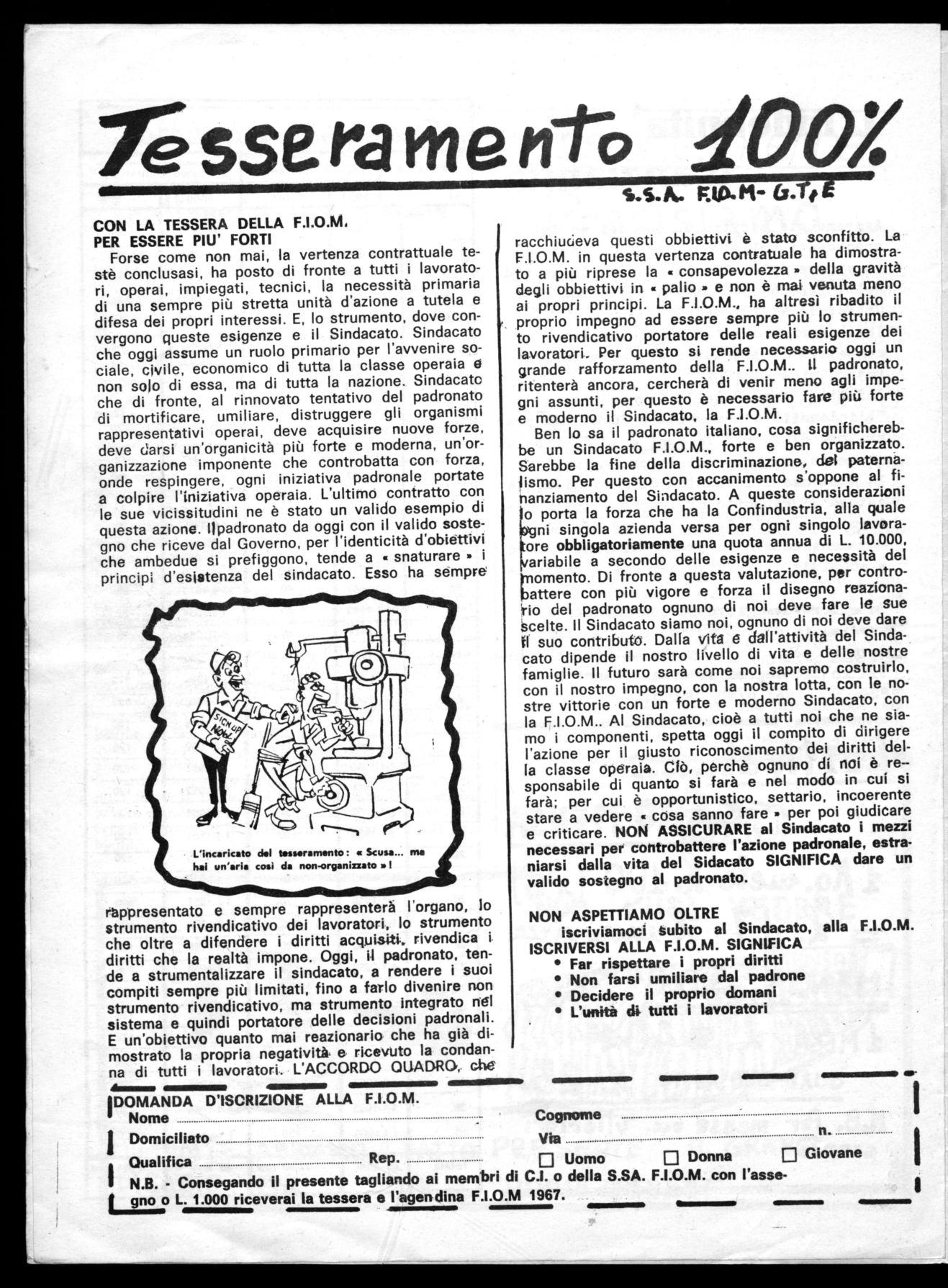 L'iscrizione al Sindacato è un atto di conferma e di fiducia alsindiseale 'unitaria FIOM-CGIL per la sua continua azione in difesa degli interessi di classe dei lavoratori, sul piano economico, normativo e sociale.