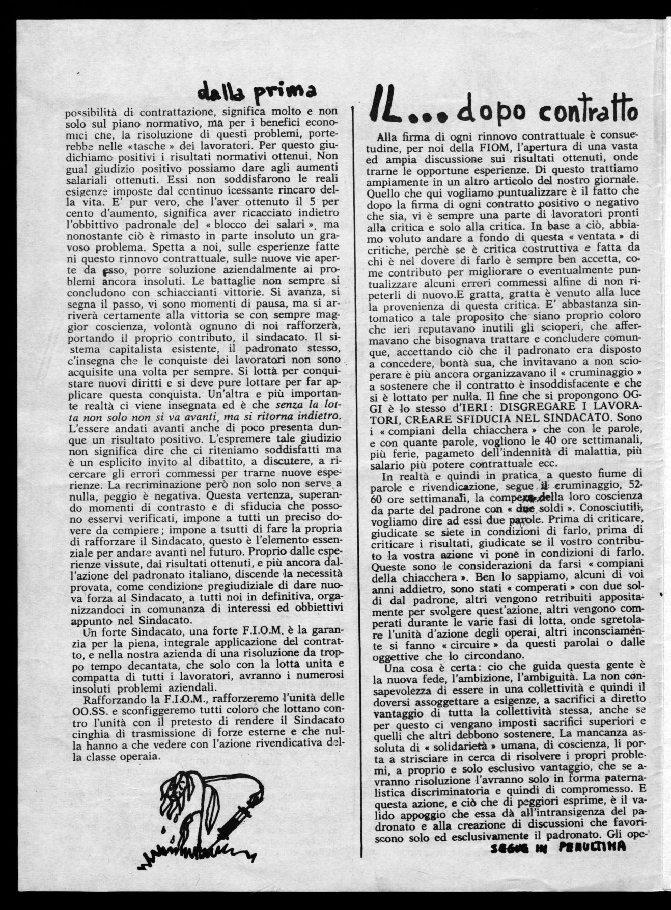 Alla firma di ogni rinnovo contrattuale è consuetudine, per noi della FIOM, l'apertura di una vasta ed ampia discussione sui risultati ottenuti, onde trarne le opportune esperienze. Di questo trattiamo ampiamente in un altro articolo del nostro giornale. Quello che qui vogliamo puntualizzare è il fatto che dopo la firma di ogni contratto positivo o negativo che sia, vi è sempre una parte di lavoratori pronti alla critica e solo alla critica. In base a ciò, abbiamo voluto andare a fondo di questa « ventata » di critiche, perchè se è critica costruttiva e fatta da chi è nel dovere di farlo è sempre ben accetta, come contributo per migliorare o eventualmente puntualizzare alcuni errori commessi alfine di non ripeterli di nuovo.E gratta, gratta è venuto alla luce la provenienza di questa critica. E' abbastanza sintomatico a tale proposito che siano proprio coloro che ieri reputavano inutili gli scioperi, che affermavano che bisognava trattare e concludere comunque, accettando ciò che il padronato era disposto a concedere, bontà sua, che invitavano a non scioperare è più ancora organizzavano il « cruminaggio » a sostenere che il contratto è insoddisfacente e che si è lottato per nulla. Il fine che si propongono OGGI è lo stesso d'IERI: DISGREGARE I LAVORATORI, CREARE SFIDUCIA NEL SINDACATO. Sono i « compiani della chiacchera » che con le parole, e con quante parole, vogliono le 40 ore settimanali, più ferie, pagameto dell'indennità di malattia, più salario più potere contrattuale ecc.