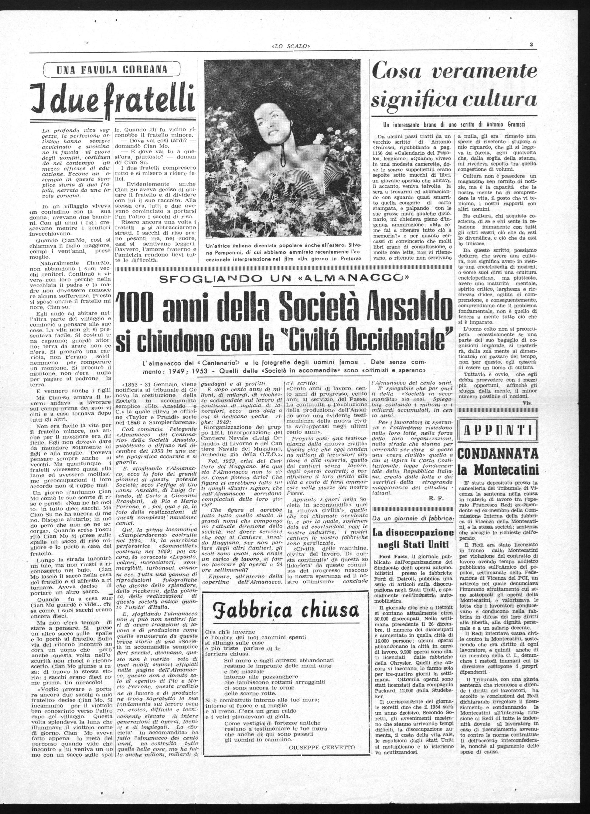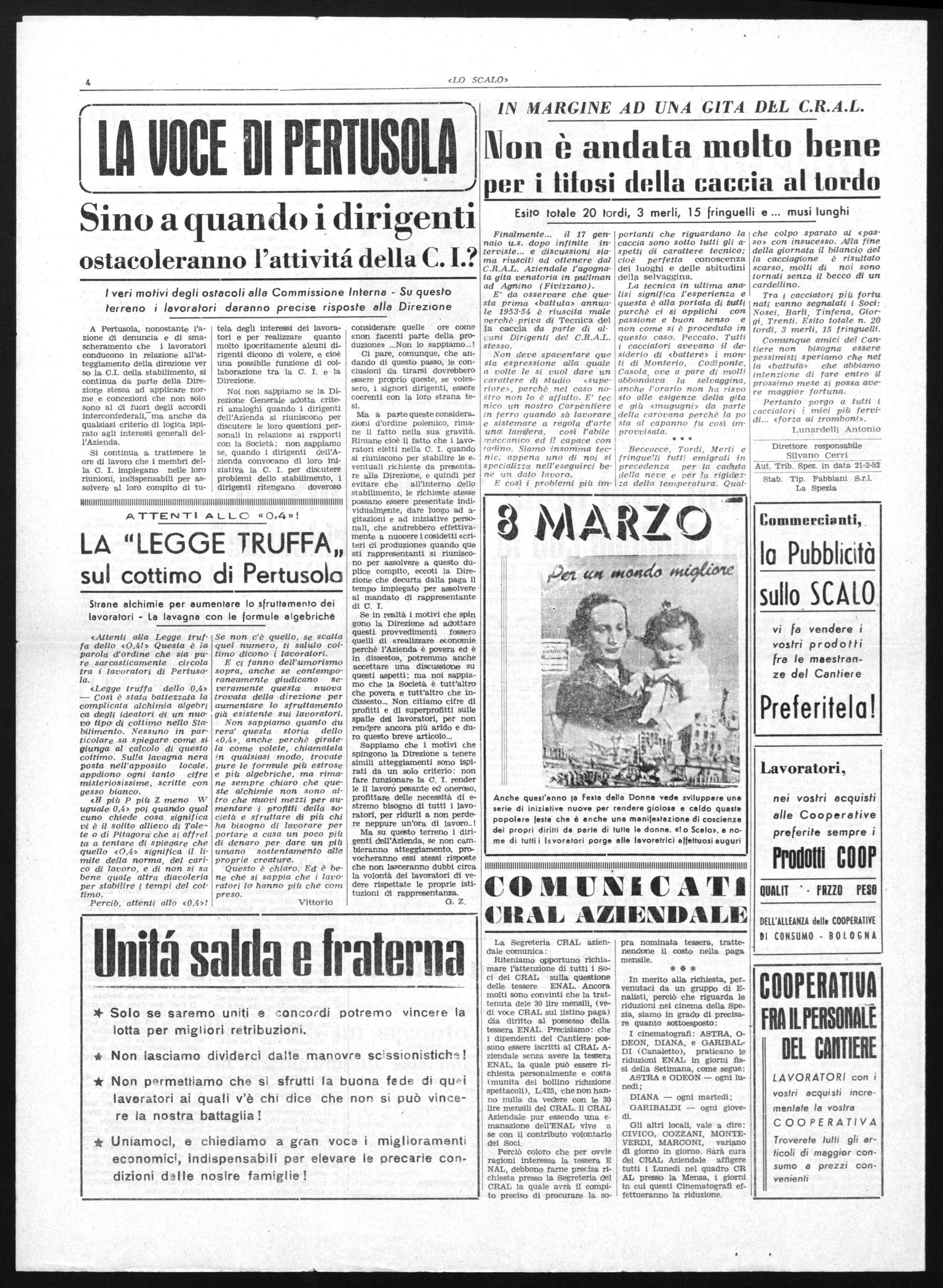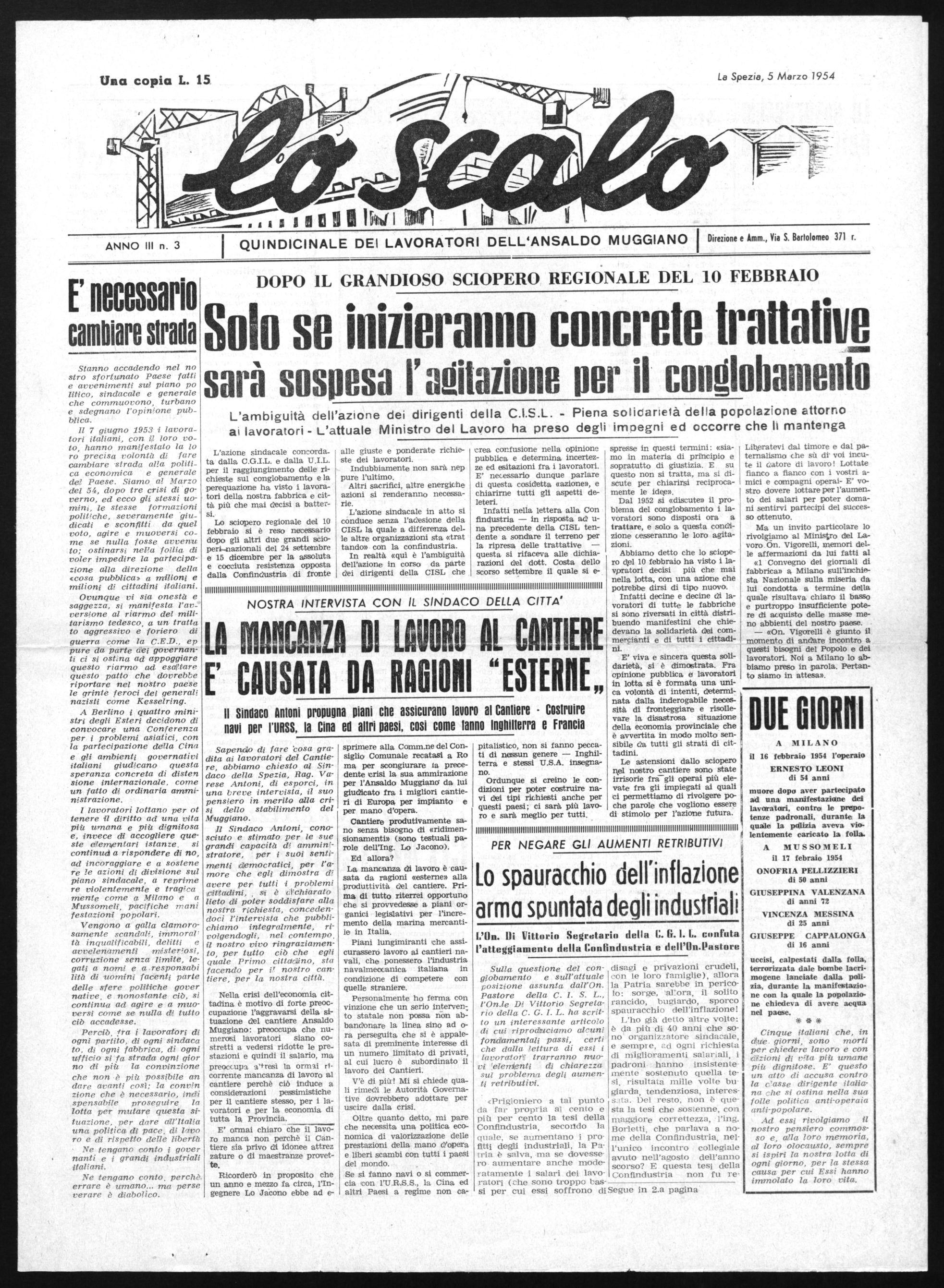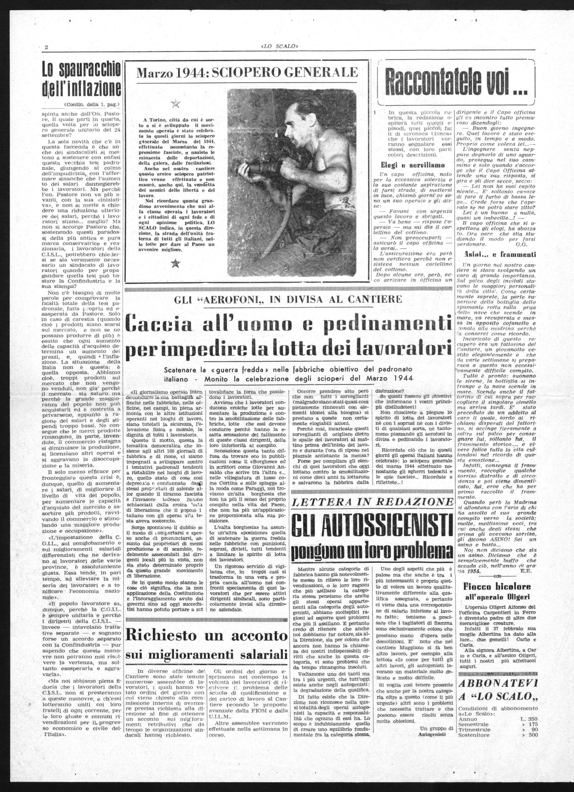 A Torino, città da cui è sorto e si è sviluppato il movimento operai« è stato celebrato in questi giorni lo sciopero ginerale del Marza del 1944, effettuato nonostante' la repressione fasciste, e naziste le minaccia delle deportazioni, della galera, delle fucilaziosi. Anche nel nostro cantiere questo eroico sciopero patriottico venne effettuato e non mancò, anche qui, la vendetta dei nemici delle libertà e del lavoro. Nel ricordare questo grandioso avvenimento che unì alla classe operaia i lavoratori e i cittadini di ogni fede e di ogni opinione politica, LO SCALO indica, in questa direzione, la strada dell'unità fraterna di tutti gli italiani, nelle lotte per dare al Paese un avvenire migliore.