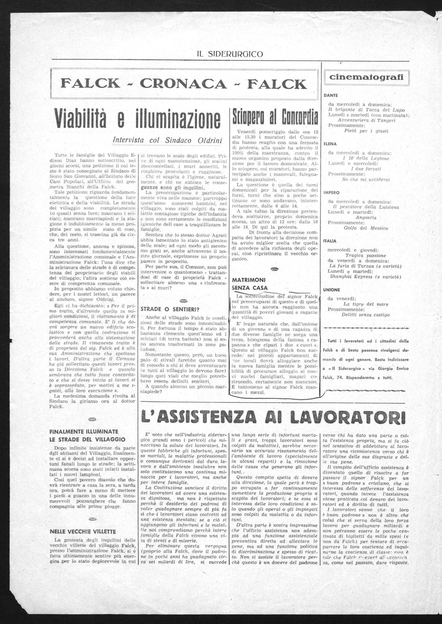 Egli ci ha dichiarato: « Per il primo tratto, d'altronde quello in migliori condizioni, il riattamento è di competenza comunale. E' lì che dovrà sorgere un nuovo edificio scolastico e con quella costruzione si provvederà anche alla sistemazione delle strade. Il rimanente tratto è di proprietà del sig. Falck ed è alla sua Amministrazione che spettano i lavori. D'altra parte il Comune ha già sollecitato questi lavori presso la Direzione Falck e quando sembrava che tutto fosse concordato e che si desse inizio ai lavori si è soprasseduto, per motivi a me ignoti, alla loro esecuzione ». La medesima domanda rivolta al Sindaco la giriamo ora al dottor Falck.