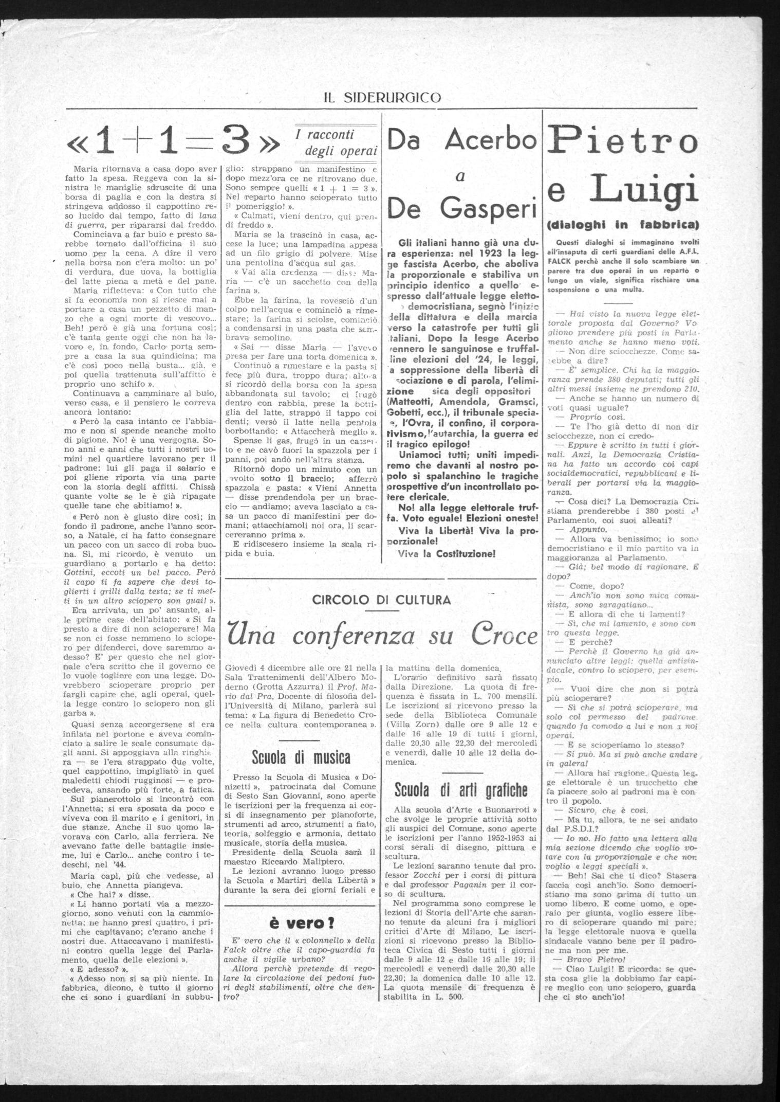 Da qualche giorno, nei vari stabilimenti Falck e, a quanto ci risulta, in altri stabilimenti di Sesto, circolano manifestini e affissi murali contro la legge elettorale proposta dal governo. Già in qualche fabbrica e reparto gli operai si riuniscono per discutere sulla anticostituziora/ità di questa legge.
