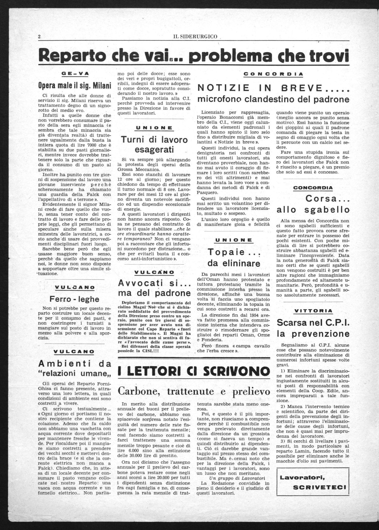Ci scrivono testualmente ... «Ogni giorno ci portiamo il nostro recipiente che contiene la colazione. Adesso che fa caldo non abbiamo una vaschetta con acqua corrente dove depositarli per mantenere fresche le vivende. Per riscaldare poi il mangiare siamo costretti a prendere dei vecchi secchi e mettervi dentro della brace (e sì che la corrente elettrica non manca a Falck). Chiediamo che, in attesa di un locale decente per consumare il pasto vengano collocate nel nostro Reparto : una vasca con acqua corrente e un fornello elettrico... Non parlia-