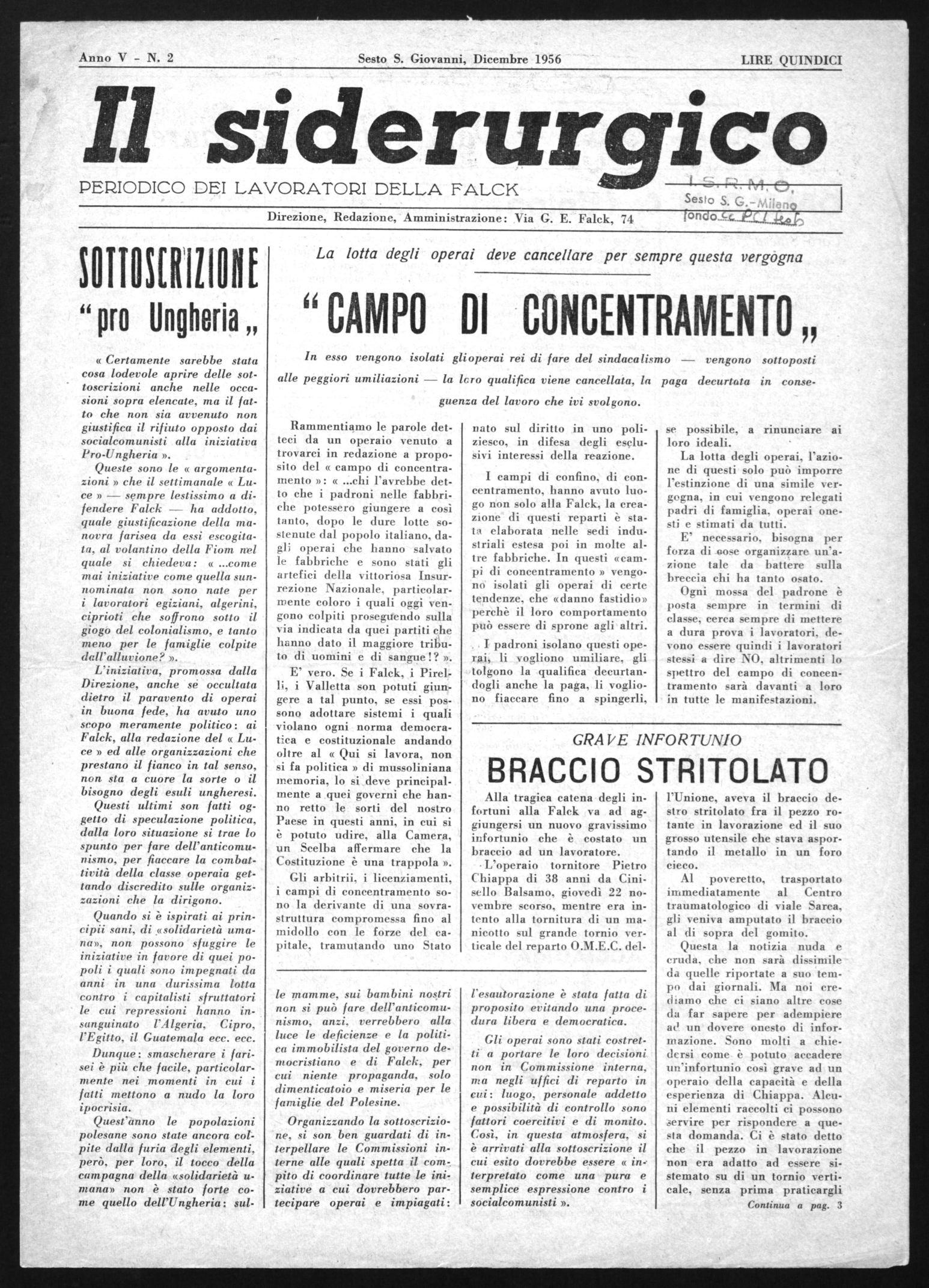 I campi di confino, di concentramento, hanno avuto luogo non solo alla Falck, la creazione di questi reparti è stata elaborata nelle sedi industriali estesa poi in molte altre fabbriche. In questi «campi di concentramento » vengono isolati gli operai di certe tendenze, che «danno fastidio» perchè il loro comportamento può essere di sprone agli altri.