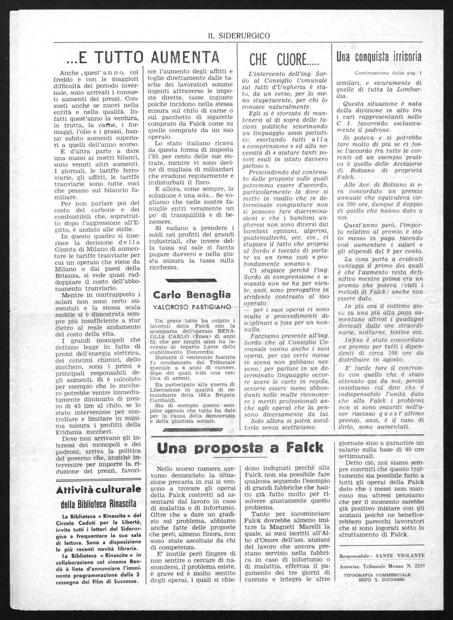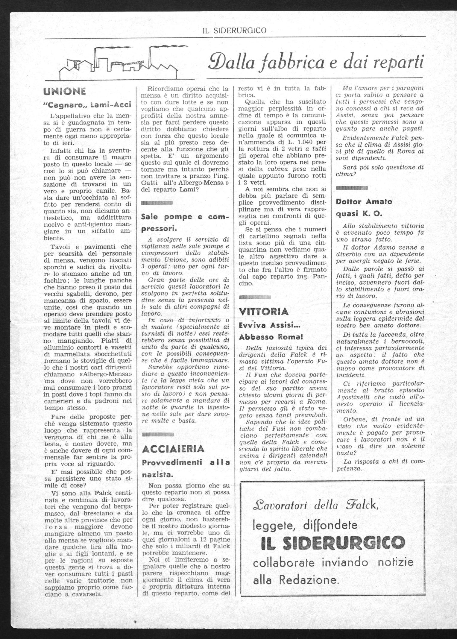 Vi sono alla Falck centinaia e centinaia di lavoratori che vengono dal bergamasco, dal bresciano e da molte altre province che per f o r z a maggiore devono mangiare almeno un pasto alla mensa se vogliono mandare qualche lira alla Moglie e ai figli lontani, e se per le ragioni su esposte questa gente si trova a dover consumare tutti i pasti nelle varie trattorie non sappiamo proprio come facciano a cavarsela.