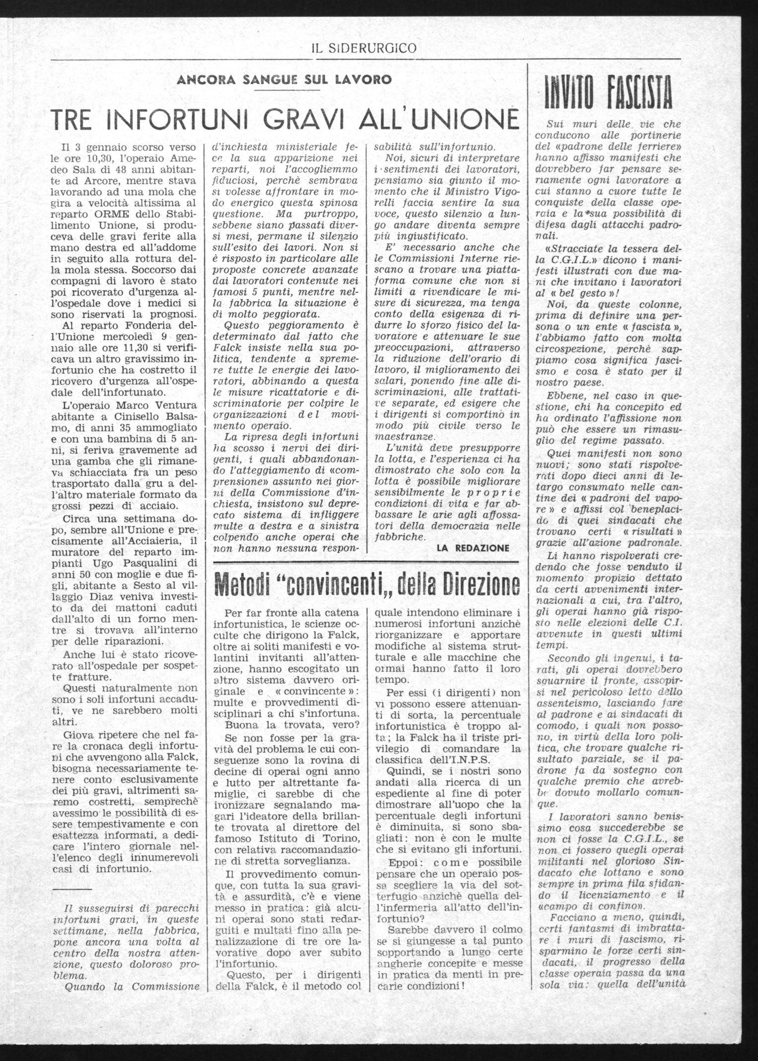 Giova ripetere che nel fare la cronaca degli infortuni che avvengono alla Falck, bisogna necessariamente tenere conto esclusivamente dei più gravi, altrimenti saremo costretti, semprechè avessimo le possibilità di essere tempestivamente e con esattezza informati, a dedicare l'intero giornale nell'elenco degli innumerevoli casi di infortunio.