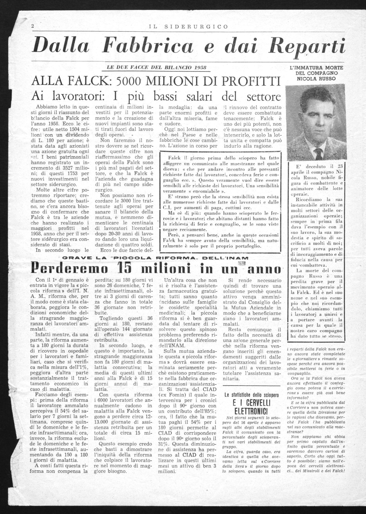 La morte del compagno Russo è una perdita grave per il movimento operaio alla Falck. Ed è nel suo nome e nel suo esempio che noi ricordandolo, chiamiamo tutti i lavoratori a unirsi e a portare avanti la causa per la quale il nostro caro compagno ha dato tutto se stesso.